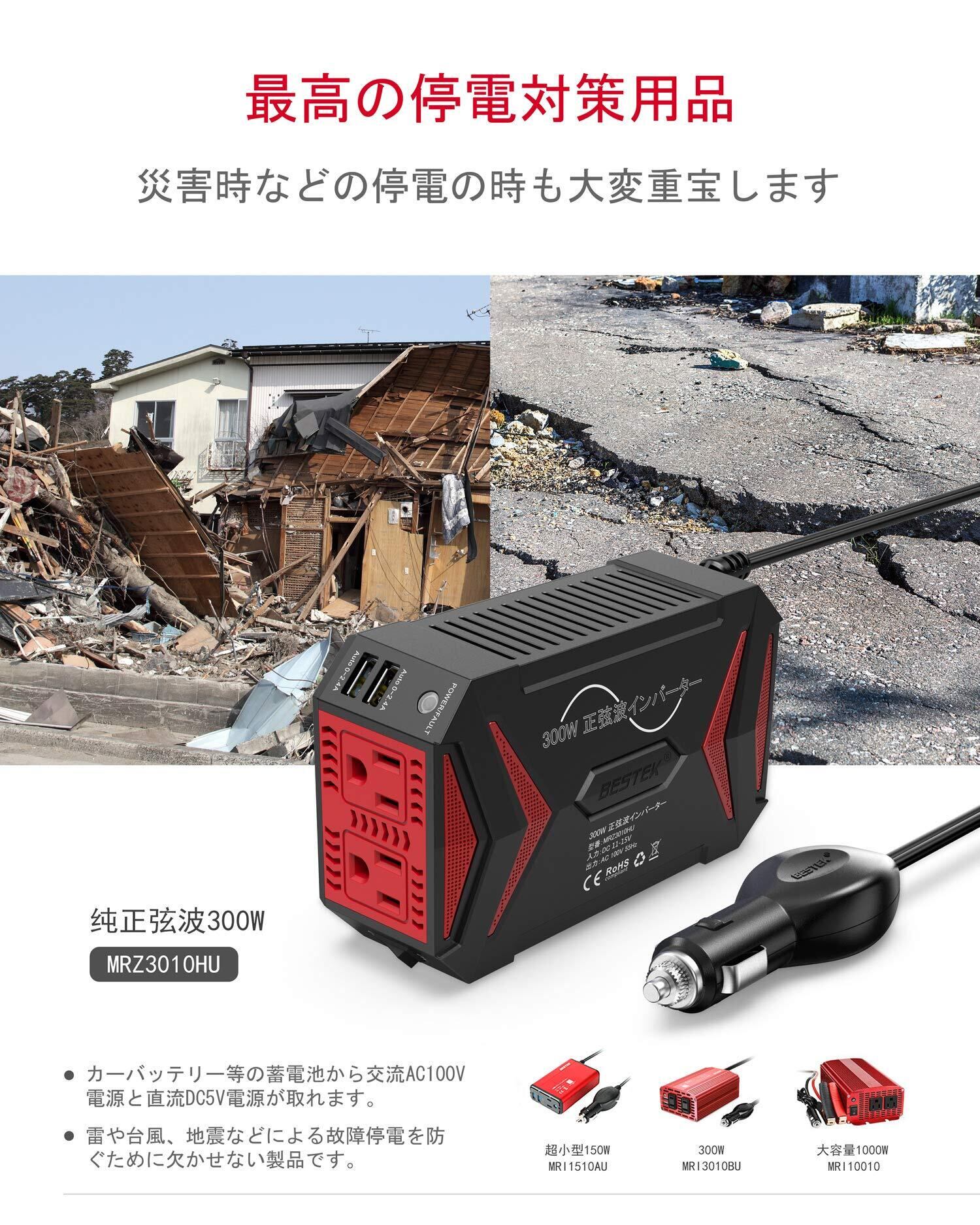 BESTEK 正弦波 インバーター シガーソケット コンセント 300W DC12VをAC100Vに変換 USB2ポート搭載 車載用インバーター カーインバーター 12V車専用 MRZ3010HU
