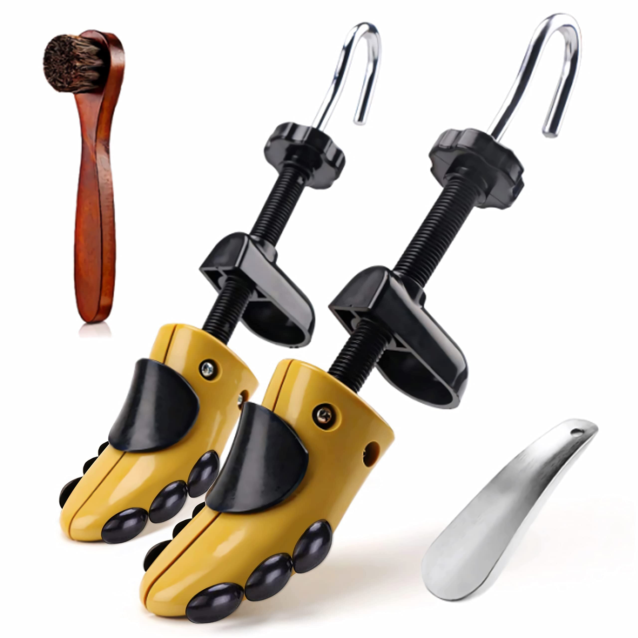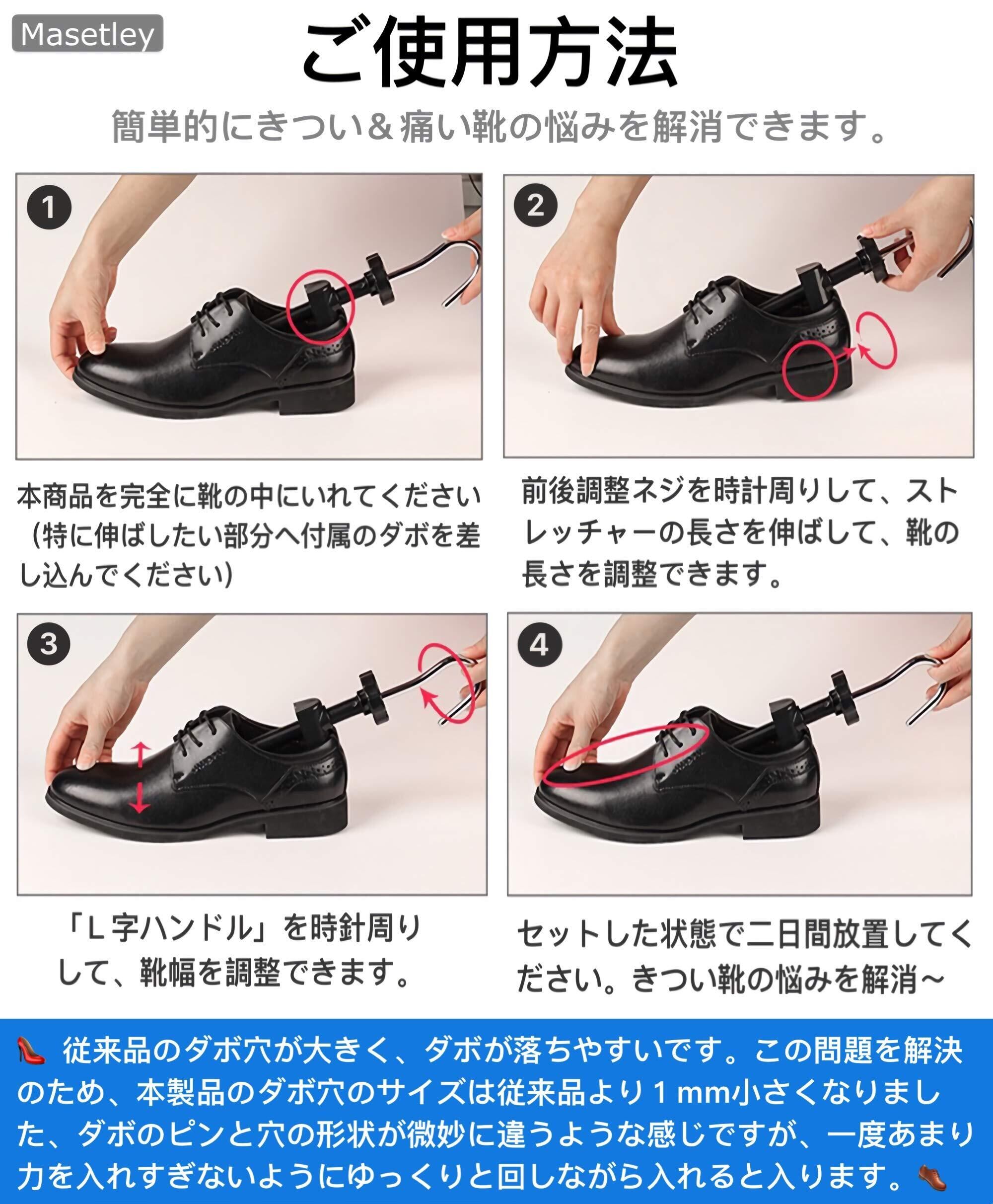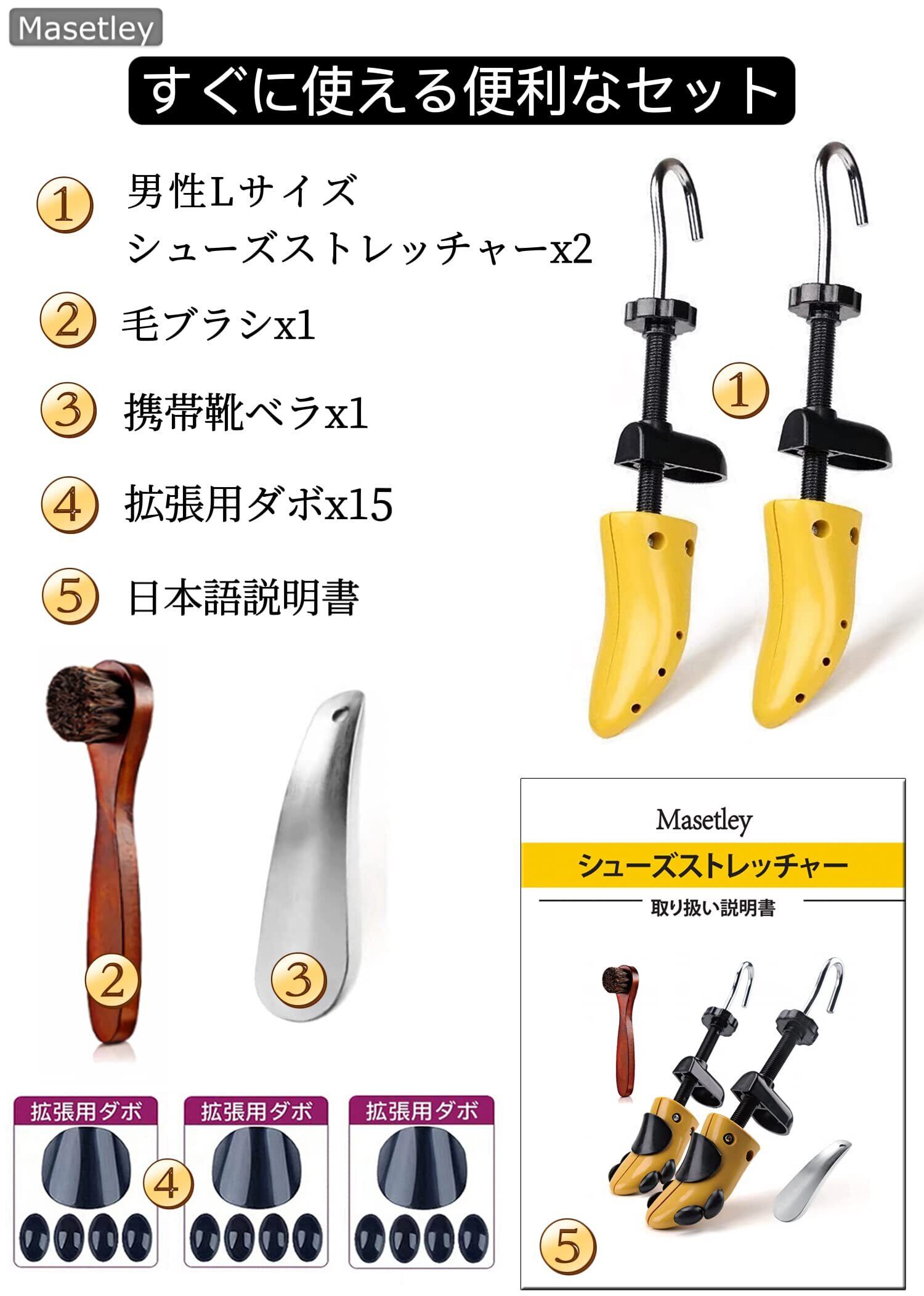 [Masetley] シューズストレッチャー シューキーパー シューズフィッター 靴サイズ調整 靴伸ばし プラスチック 靴擦れ 靴ズレ 馬毛プラシ 携帯靴べら付 メンズ レディース 二個セット 左右兼用