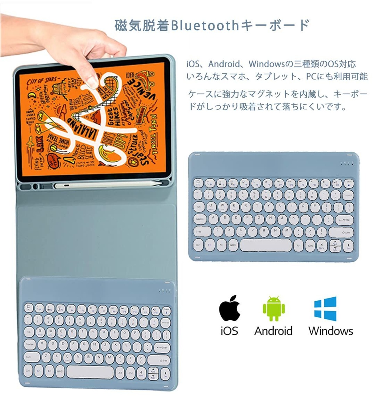 【分離式】Bluetoothキーボードはカバーとマグネット分離式でそれぞれ単独に使用できます、Windows・Android・iOSの3種類のOS対応なので、色んなスマホ、タブレットでの利用可能です。