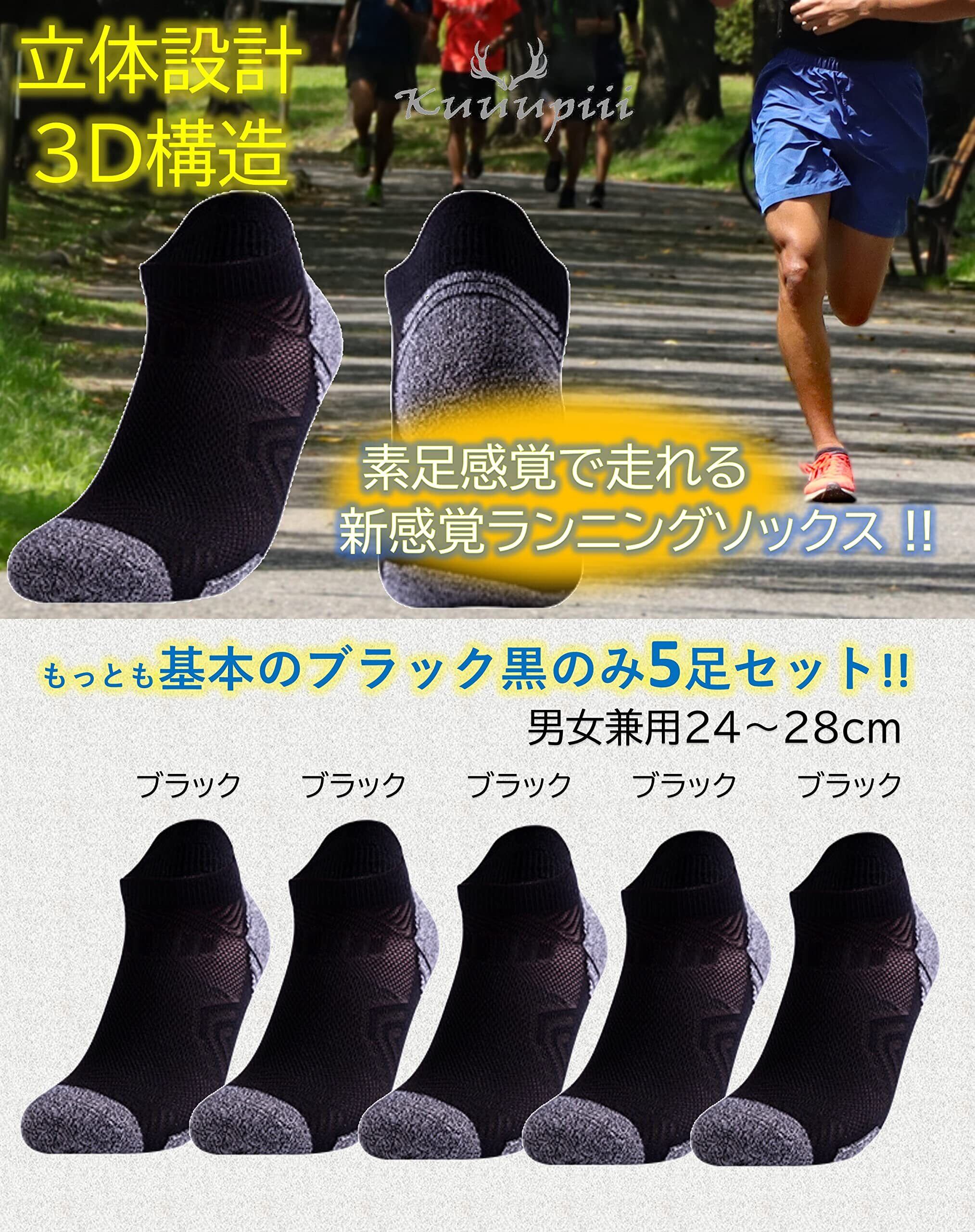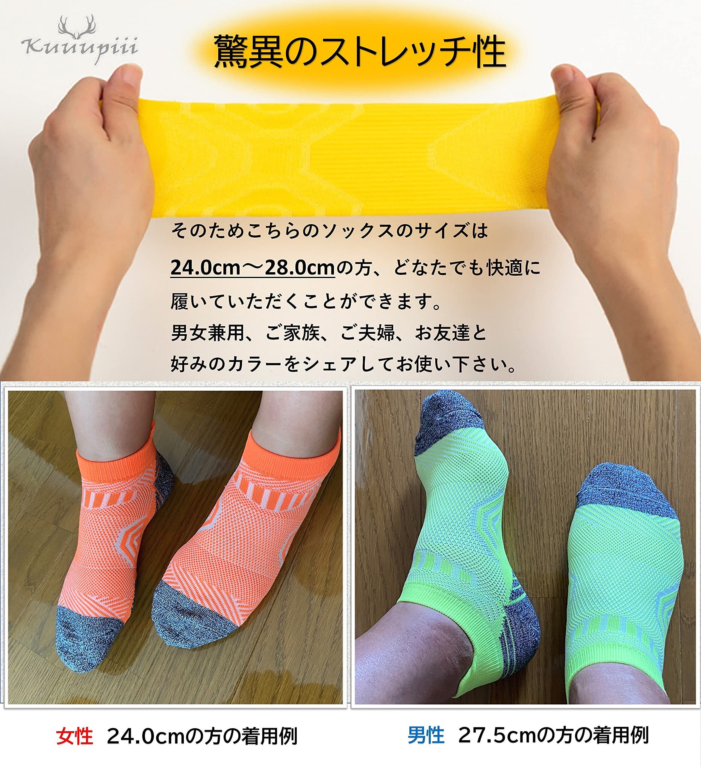 【kuuupiiiランニングソックスの特徴①】立体設3D構造+新特殊ナイロン素材で今までにないフィット感を実現 伸縮性が良いため24~28cmと幅広いサイズ対応を可能にし、男女兼用にて幅広い方々にご着用いただけます。