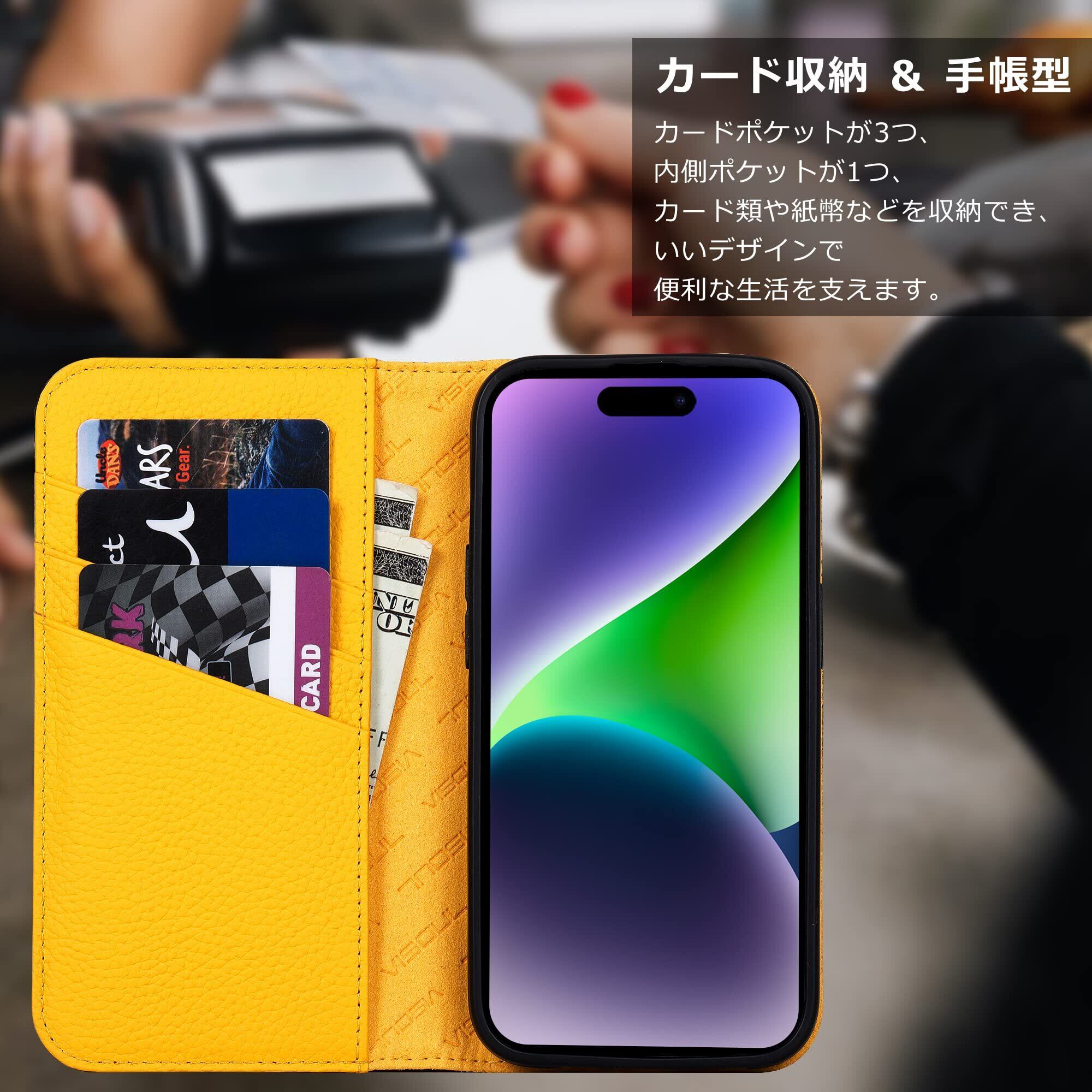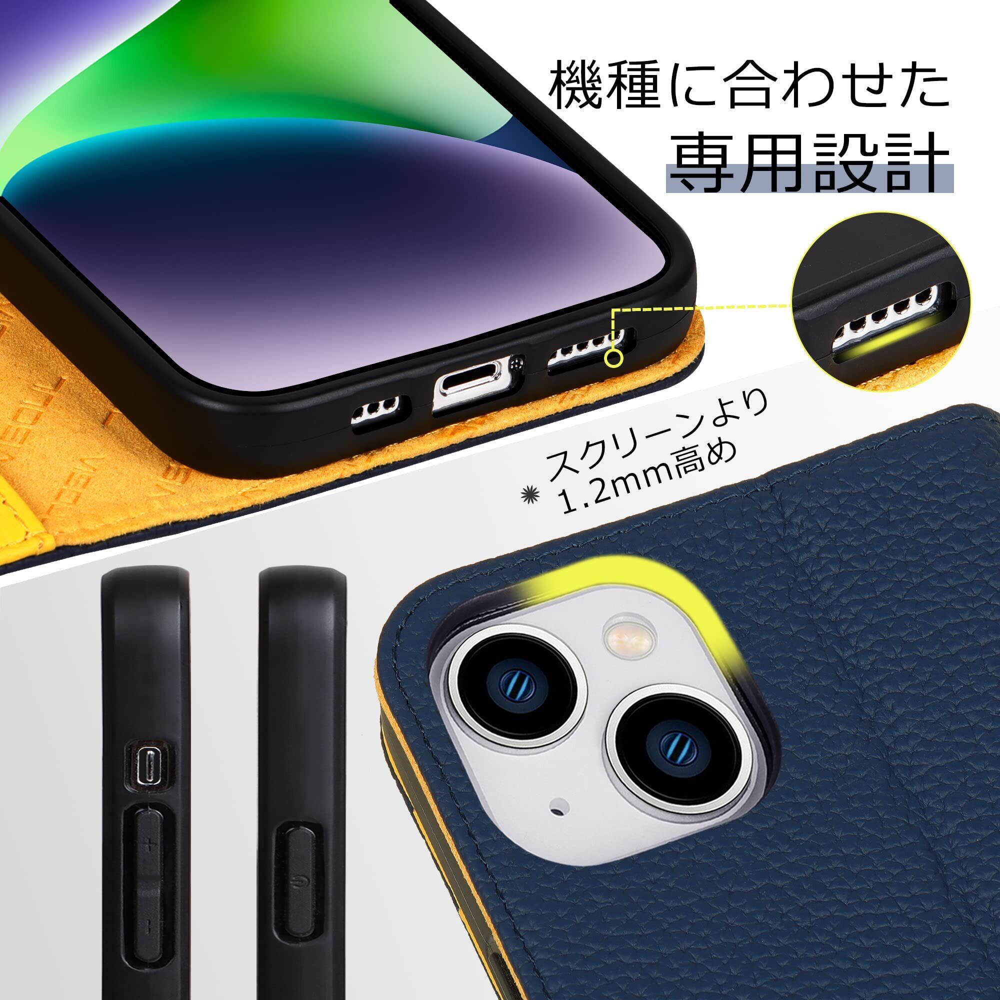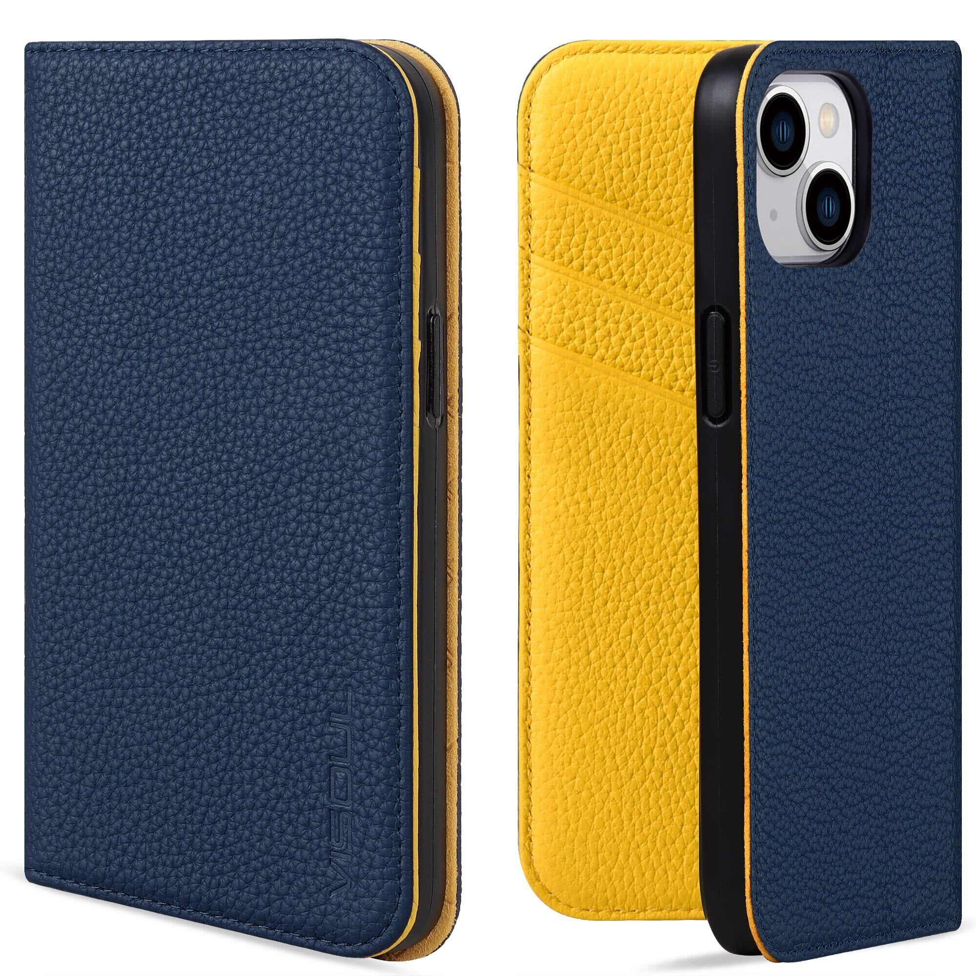 VISOUL iphone14 ケース 手帳型 本革 レザー スマホケース アイフォン14手帳型 カード収納 携帯ケース 全面保護 柔軟なTPU素材 マグネット式 スタンド機能付き アイホン14 対応 6.1インチ iphone 14 ネイビー レモン