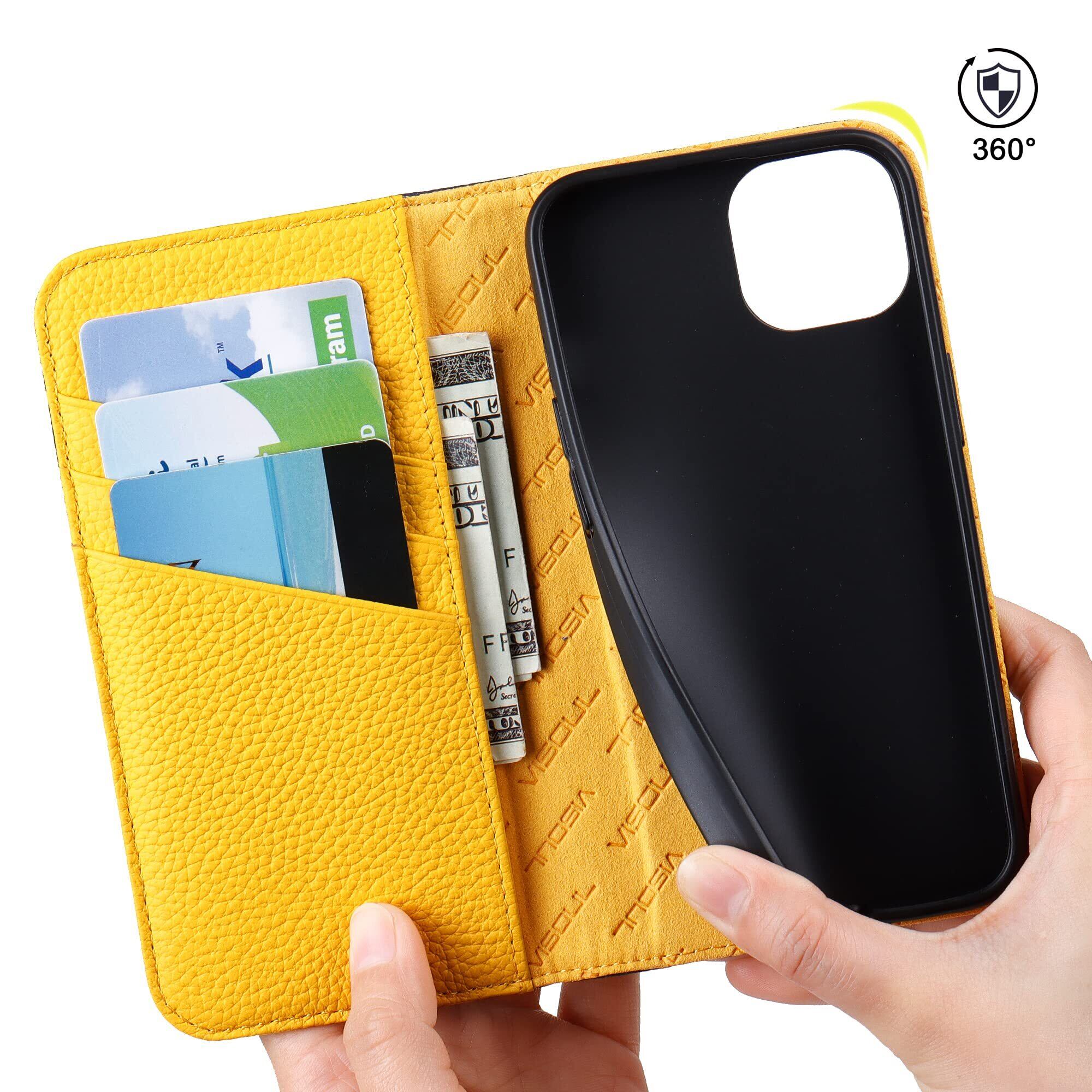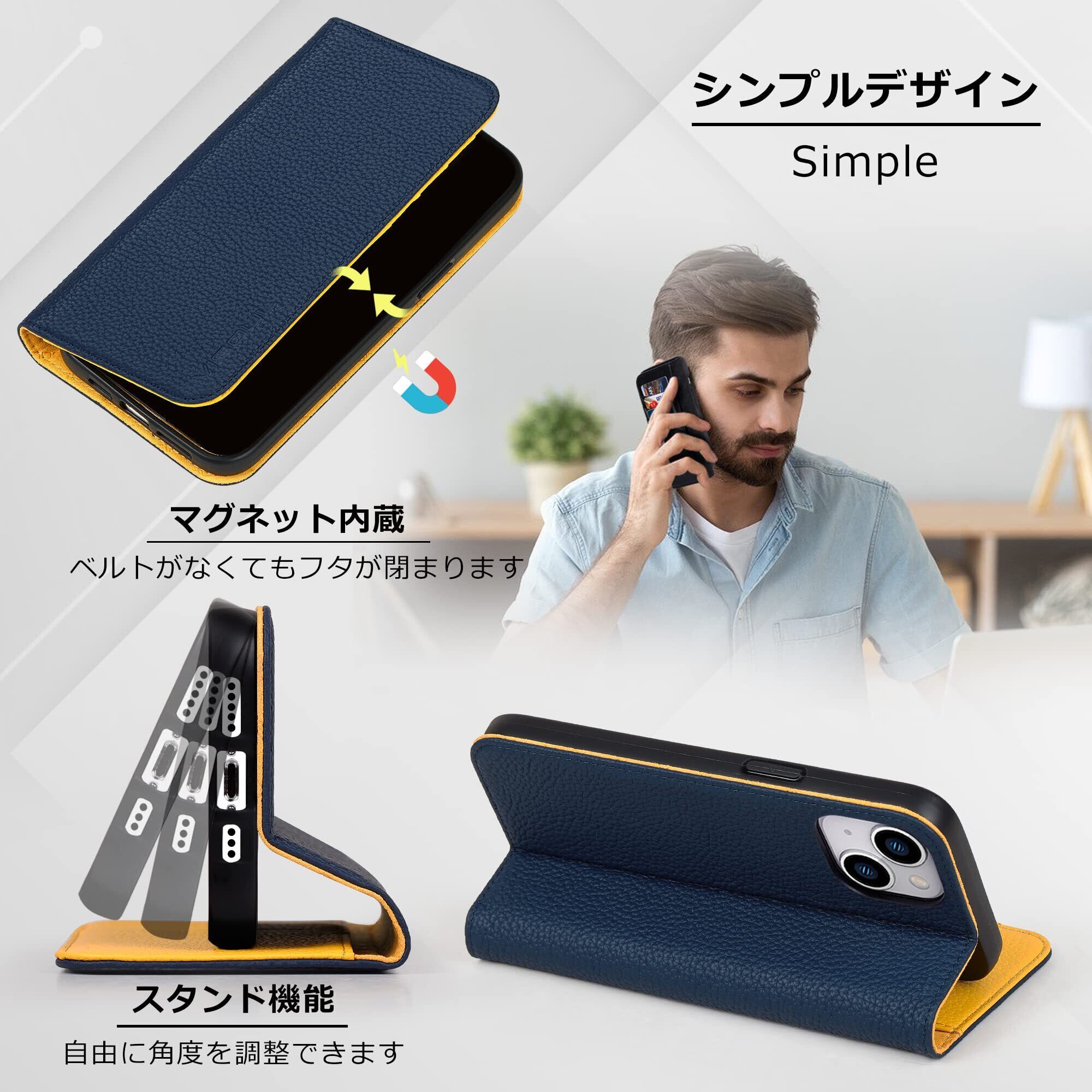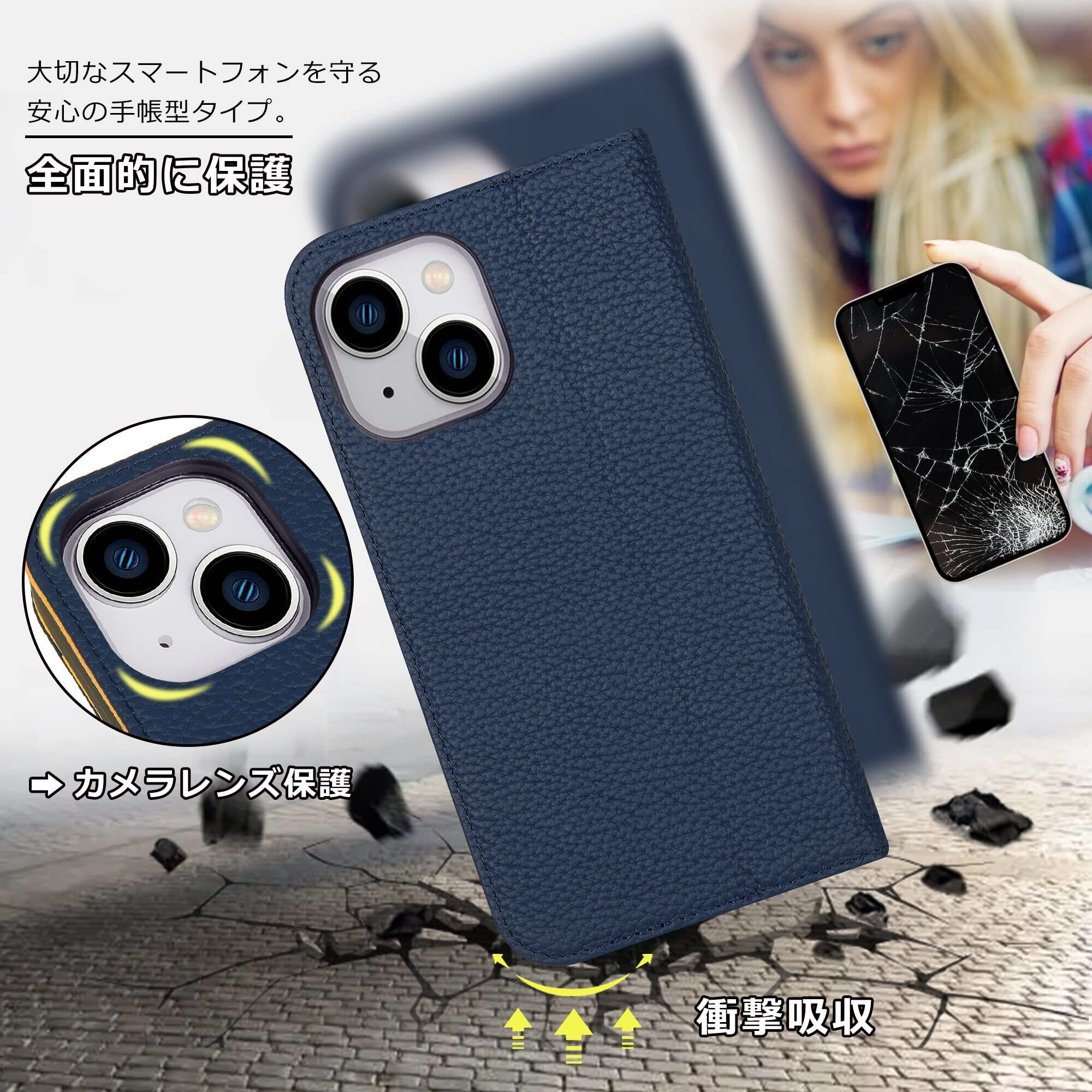 VISOUL iphone14 ケース 手帳型 本革 レザー スマホケース アイフォン14手帳型 カード収納 携帯ケース 全面保護 柔軟なTPU素材 マグネット式 スタンド機能付き アイホン14 対応 6.1インチ iphone 14 ネイビー レモン