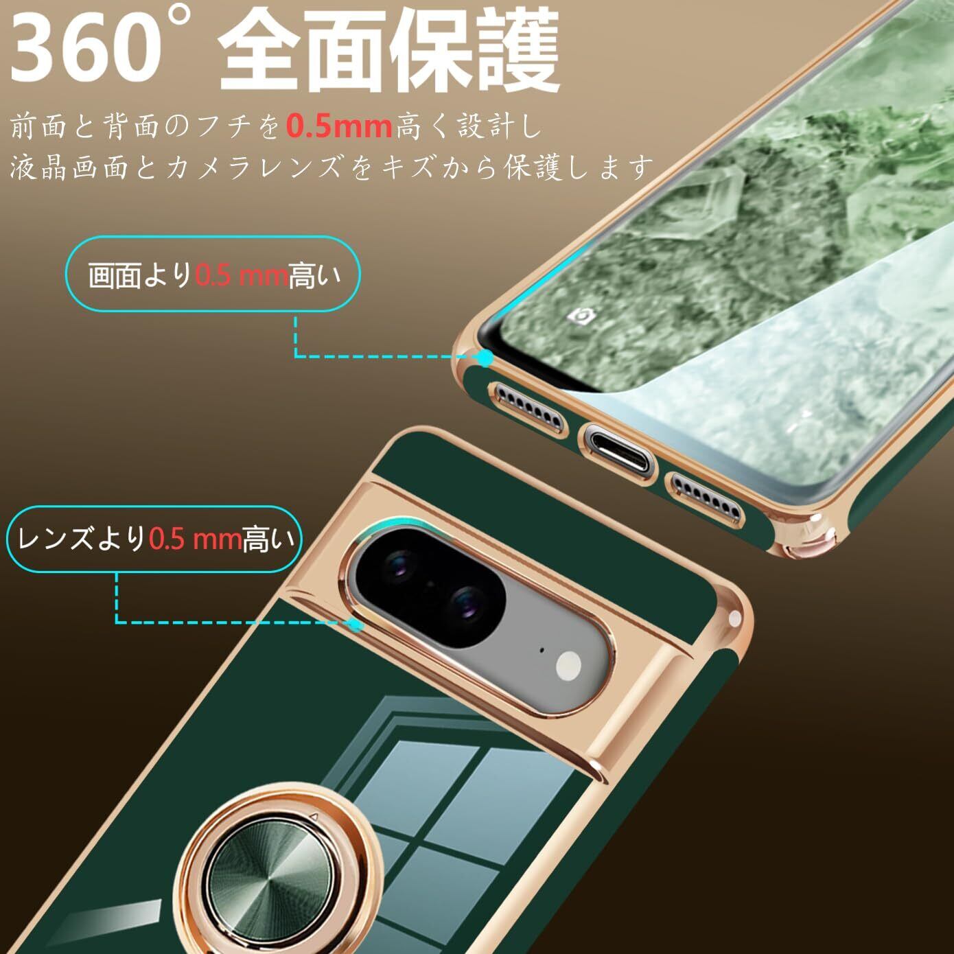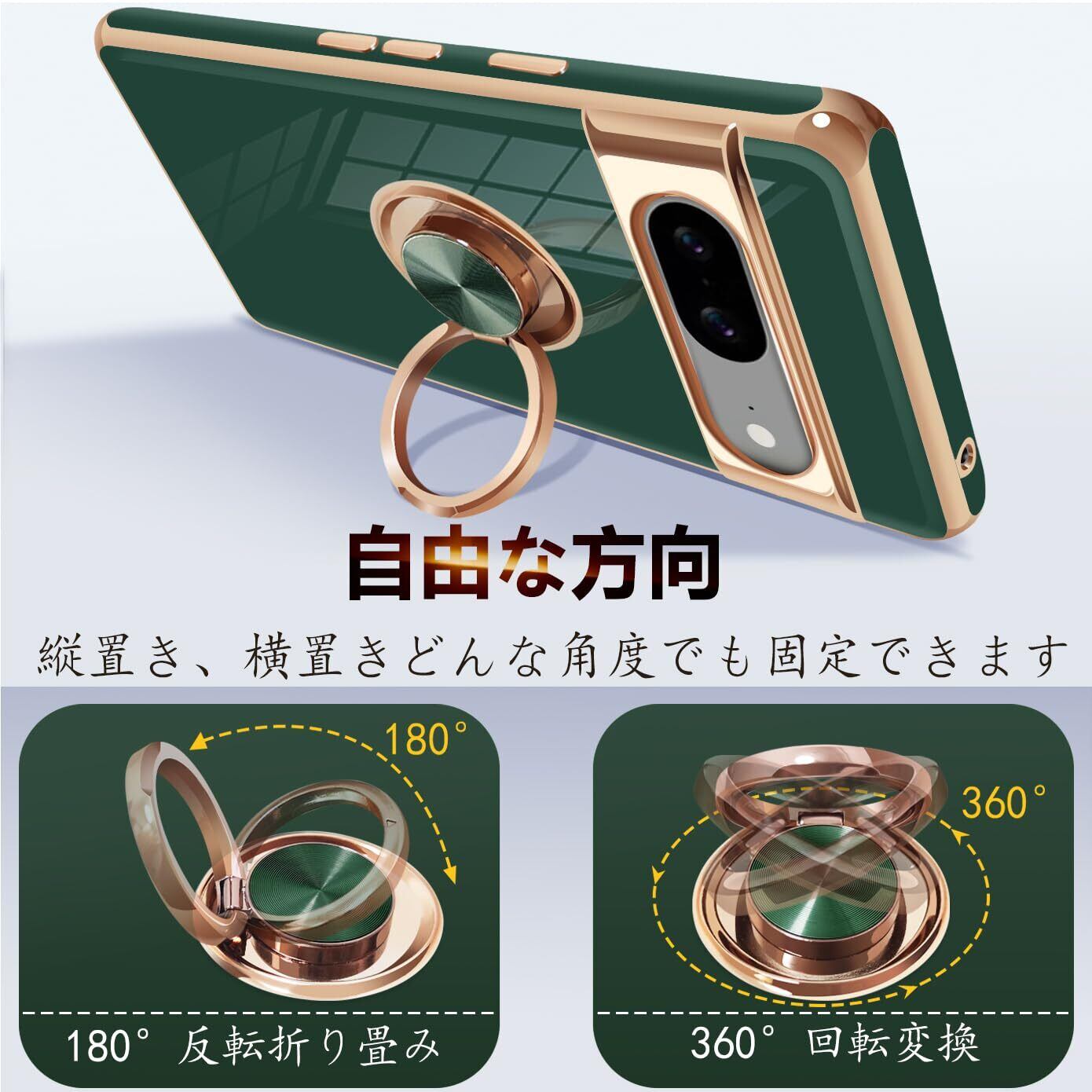 Google Pixel8 ケース リング付き グーグル ピクセル 8 リング カバー 耐衝撃 TPU メッキ加工 360°回転 スタンド機能 車載ホルダー ストラップホール付き(ダークグリーン)