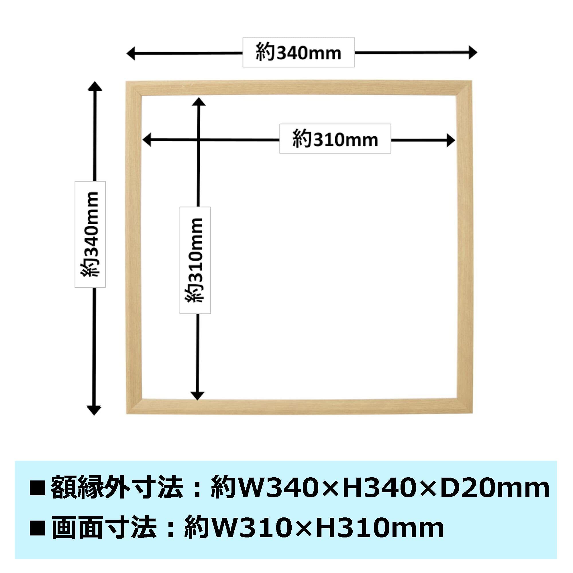 フレーム材質 : 木製、額縁外寸法 : 約W340×H340×D20mm、画面サイズ : 約W310×H310mm、前面板 : PS板、重量 : 約730g、参考収容寸法 : 約W320×320×D8.2mm