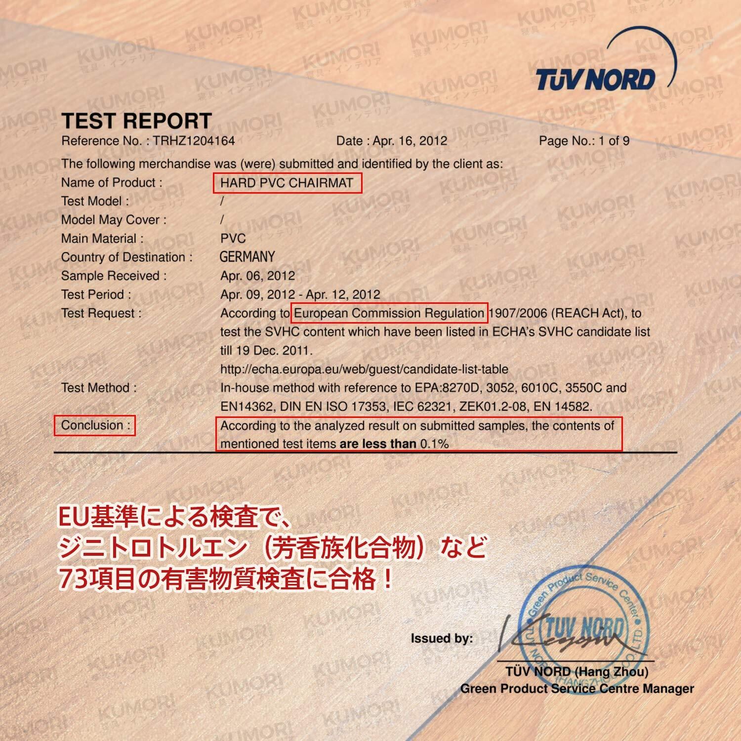 「本製品のポイント」1.床のキズ防止ができる。2.お手入れ簡単。防汚、防湿、防水性能あり、汚れても雑巾で拭くだけでキレイになる。3.丈夫で長持ち。耐荷重は約300kg、耐衝撃強度は硬質塩ビの約200倍になる。4.安全。地震などの災害や、強くぶつかっても破損・飛散しない。5.床暖房に対応可能。6.無毒無害。認証機関「TUV NORD」の有害物質試験に合格。7.収納便利。8.滑り止め加工あり。
