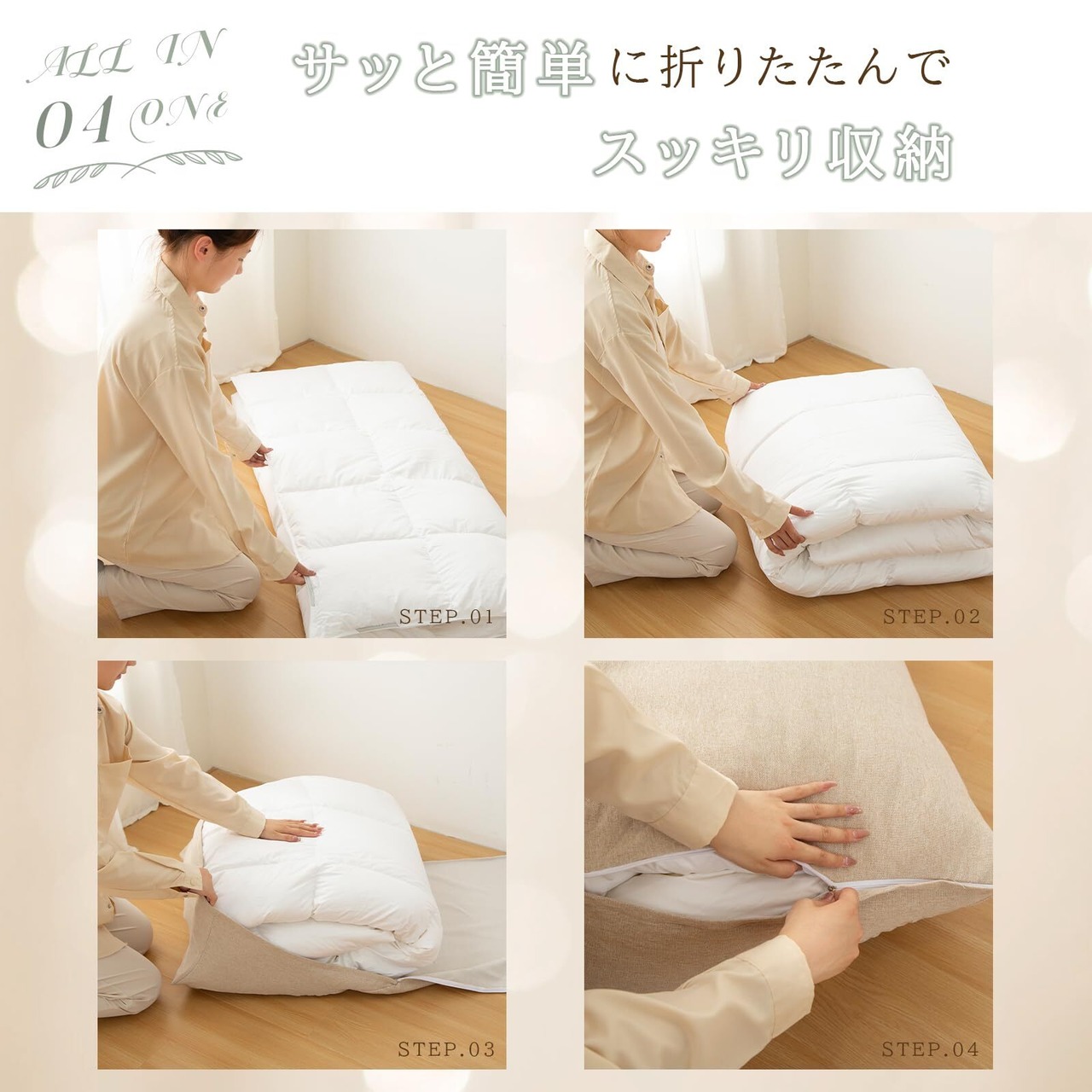 「クッションになる布団収納ケース」収納とインテリアを両立する快適な空間づくりを実現。ナチュラルな色合いの高品質な生地で、来客時にも生活感なく空間に溶け込みます。布団収納だけでなく、インテリアとしても優れたデザインです。