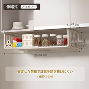 【長さ調節可能】伸縮式吊り下げ棚の長さは、お好みに合わせて調整できます。伸縮範囲は36から60センチメートルで、さまざまなサイズの収納スペースに対応しています。