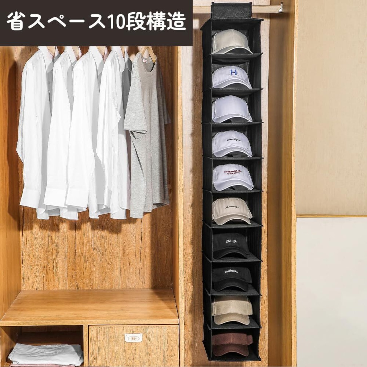 【10段構造|省スペース】帽子の形を保ちながら収納スペースが10倍に拡張!ポールに簡単装着して帽子をいれるだけで、クロゼットが驚くほどスッキリ!