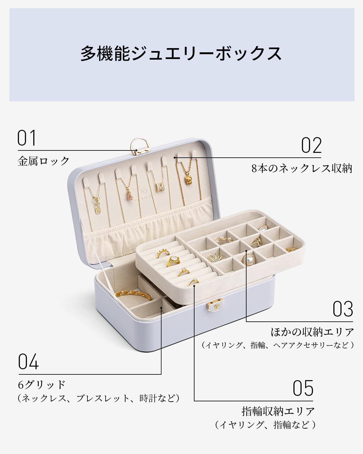 【使いやすさと実用性】大容量で機能的な収納、高級感のある外観、安全性の高い鍵付き設計など、Vlando二段式ジュエリーボックスは実用性と使いやすさを兼ね備えた優れた製品です。ジュエリーコレクションの整理に最適なアイテムです。