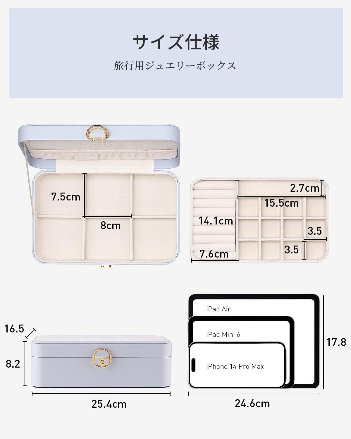 【大容量収納】寸法16.5*8.2*25.4cmの大容量設計で、Vlando二段式ジュエリーボックスはネックレスは8本以上、リングは16個以上の収納が可能です。時計やブレスレット、ピアスなどの小物も自由に収めることができます。豊富な収納スペースにより、あなたのジュエリーコレクションを一箇所にまとめて整理できます。鍵付きの構造で大切な品々を守り、柔らかな人工皮革製の上品な外観はインテリアにもなじみます。洗練されたデザインと高品質な仕上がりで、ジュエリーコレクションの中心となる収納ボックスです。