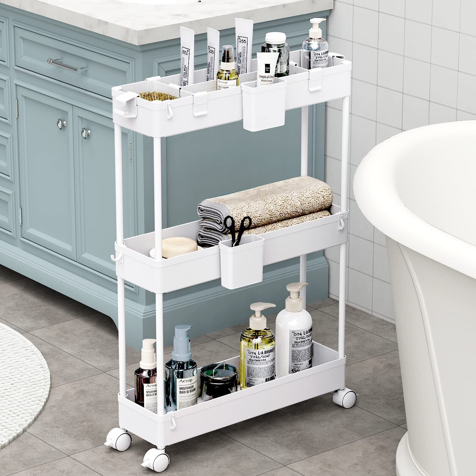 SPACEKEEPER キッチンワゴン 隙間収納 スリム 13cm 収納カップ 仕切板付き 多機能 小物 食品 調味料 キャスター付き 組立簡単 浴室 台所 冷蔵庫横 3段 ホワイト