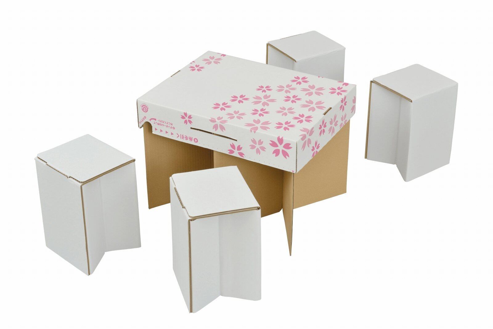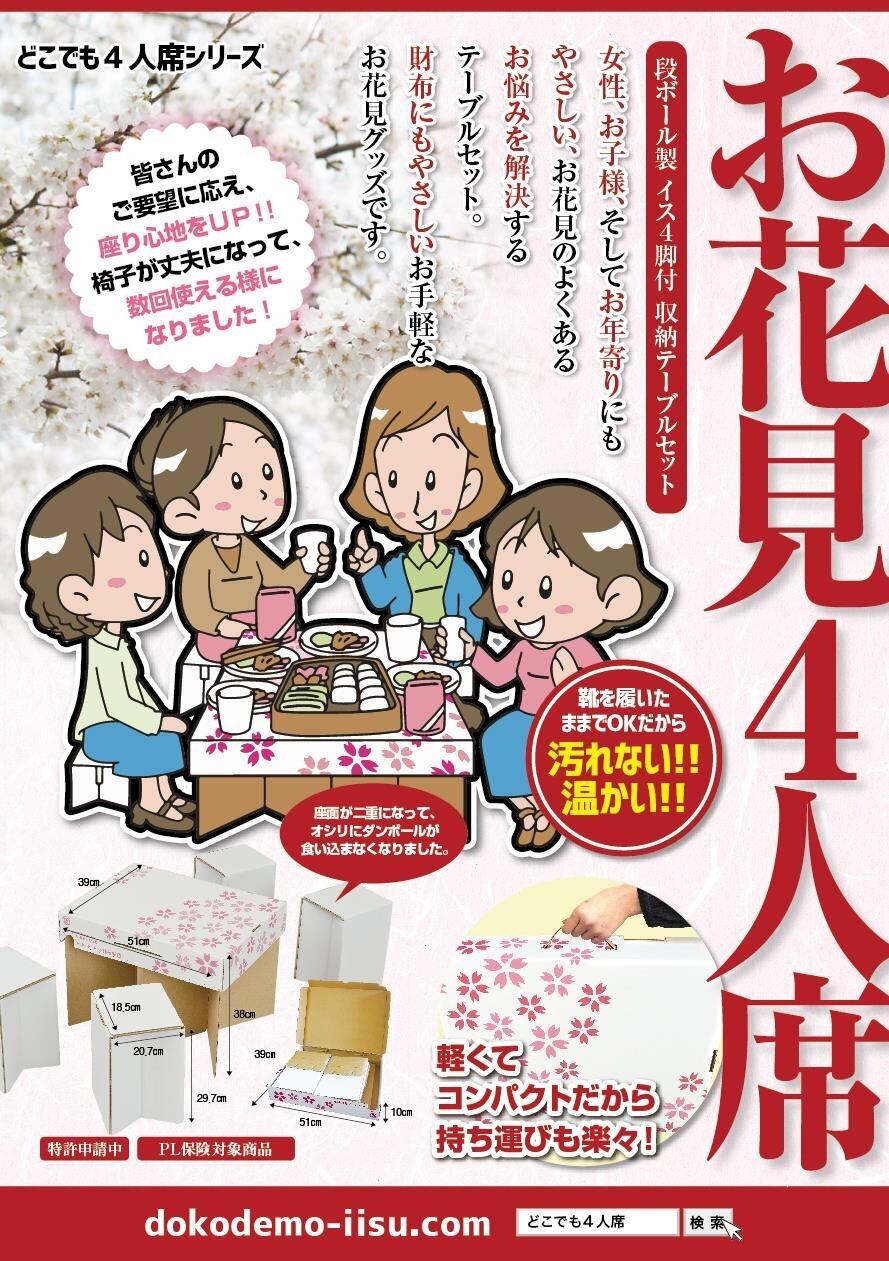 桜柄の収納ボックス段ボールイスを4つセットしたお花見セットです。2017年バージョンは椅子の座面が2重になり、座り心地がUPしました。昨年はトレたまにも取り上げられ、今年のNHKのまちかど情報局にも取り上げられました。お花見を快適に過ごすためのテーブルセットです。段ボールのイスは地べたに座ることをさせませんので、暖かいお花見が可能です。テーブルには撥水加工がされています。 コンパンクトなので、狭い場所でも楽しいお花見が出来ます。また、テーブルの上にコップやおつまみを乗せますので衛生的でこぼしにくいメリットもあります。