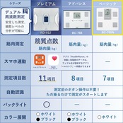 体重、体脂肪率、BMI、筋肉量、内臓脂肪レベル、基礎代謝量、体内年齢がわかります。前回値表示、アスリートモード機能も搭載