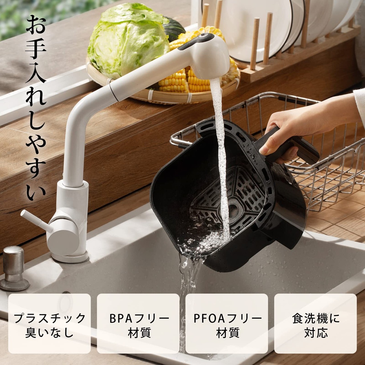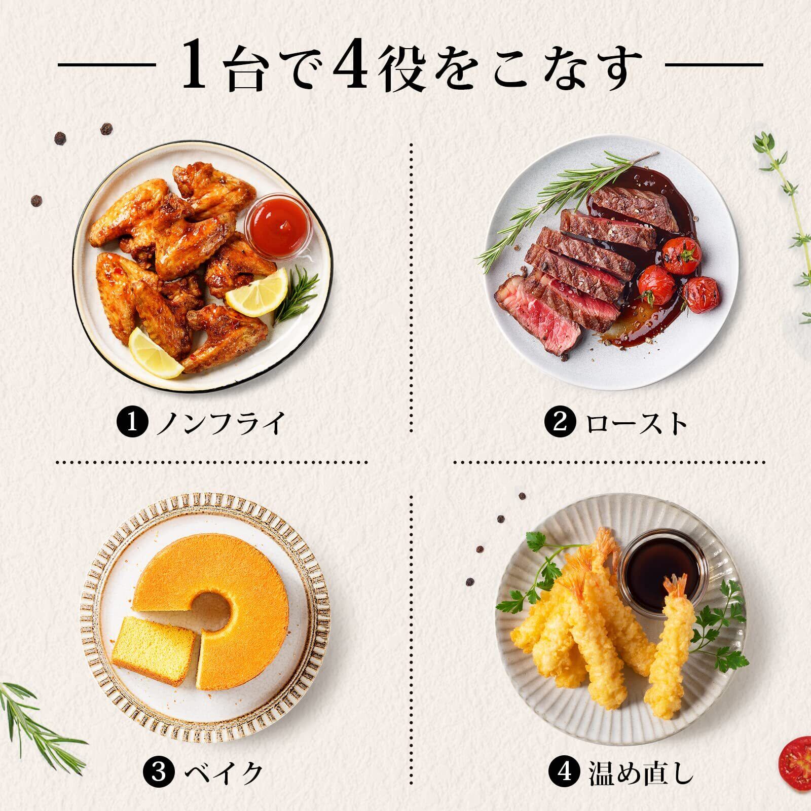 【使い道たくさん】唐揚げやトンカツなどの揚げ物をヘルシーに調理できる「ノンフライ」機能はもちろん、「ロースト」・「ベイク」・「温め直し」など様々な調理モードを楽しめます。デザートがお好みの方はベイクモードで手軽にケーキを作れます。ローストモードでは、ステーキや焼き魚などをより良い焼き加減で仕上がります。さらに、スーパーで買ったお惣菜などをサクサクの食感に復活させる「温め直し」モードも完備しています。※食材を予熱する必要がある場合、何も入れずにエアフライヤーの温度を調理したい温度まで温めておきましょう。