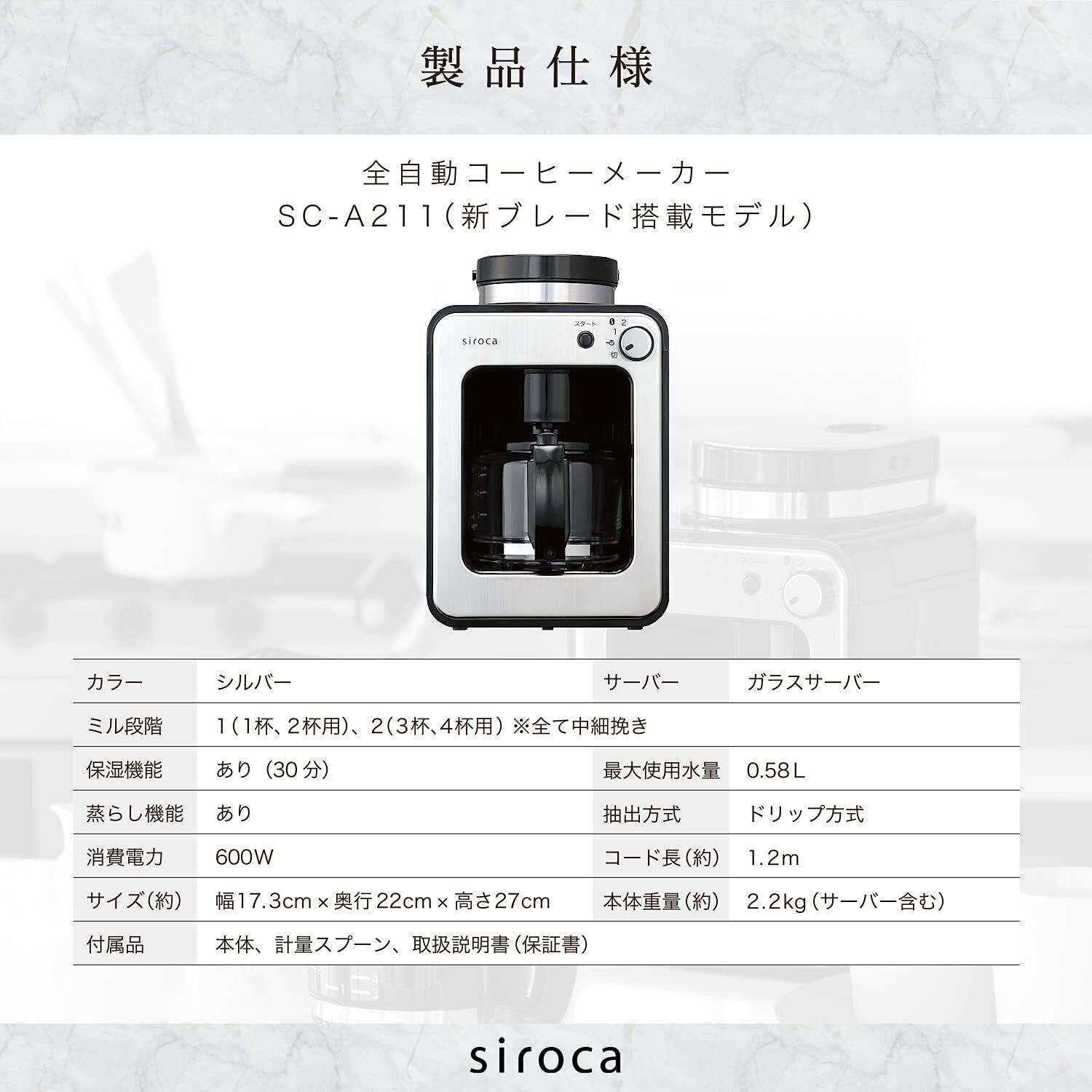 シロカ 全自動コーヒーメーカー アイスコーヒー対応 静音 コンパクト ミル2段階 豆/粉両対応 蒸らし ガラスサーバー SC-A211 ステンレスシルバー…