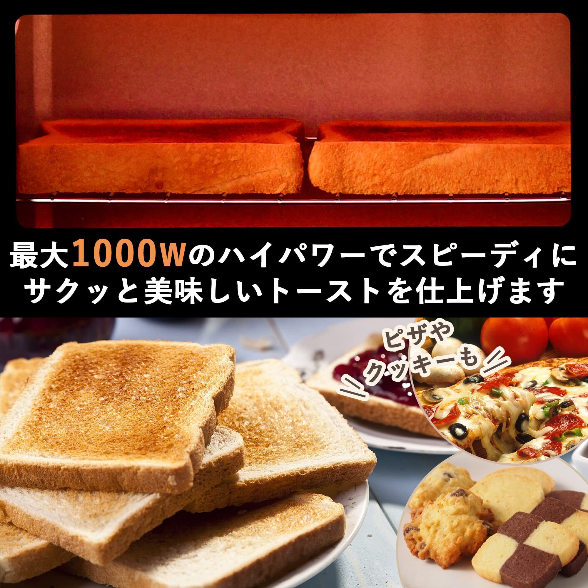 【ハイパワー1000W】高火力の1000Wでスピーディにサクッと美味しいトーストを仕上げます。一度に2枚まとめて食パンが焼けるので、忙しい朝でも安心です。
