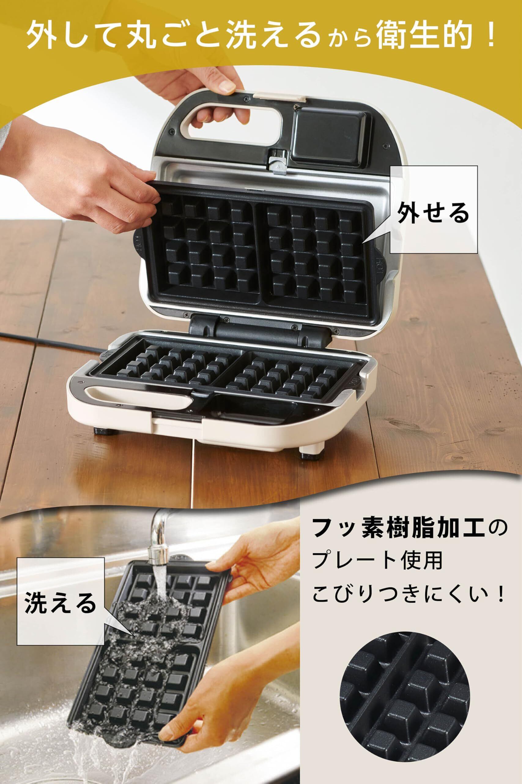 【外して洗えるプレート】フッ素樹脂加工のプレートは汚れがつきにくく、取り外して丸洗いできるので調理後のお手入れもかんたんで、衛生的。さらに、タイマー付きでお好みの焼き加減に調節可能。電源オフも兼用の10分タイマー付きだから、切り忘れが心配な方にもおすすめのホットサンドメーカーです。