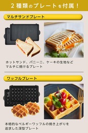 【サクッ、ふわっの焼き上がり】900Wのハイパワーでスピーディーな立ち上がり。焼き上がりを追求した、プレートの形状と高温設計。ワッフルプレート、マルチサンドプレートの2種類のプレートを付属なので、ホットサンドベーカーやワッフルメーカーとしてなどシーンに合わせてお使いいただけます。全10種類のスペシャルレシピ付きで、買ってすぐに使えます。