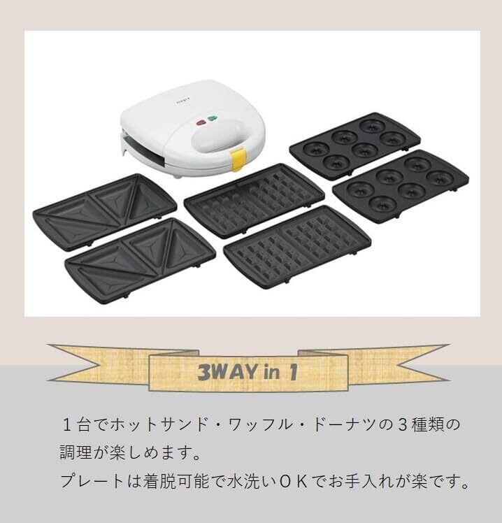 1台でホットサンド・ワッフル・ドーナツの3種類の調理が楽しめます。プレートは着脱可能で水洗いが出来ますので使用後のお手入れが簡単です。 【ホットサンドプレート】耳を切った食パンを合わせて2組並べて焼ける、Wプレートです。お好みの具材を挟んでお気に入りのホットサンドが作れます。 【ワッフルプレート】アメリカンワッフルやベルギーワッフルなど本格ワッフルを自宅で生地から焼き上げます。同時に2枚のワッフルが焼けます。 【ドーナツプレート】油げ揚げないヘルシーな焼きドーナツが同時に6個焼きあがります。おやつにぴったりサイズです。