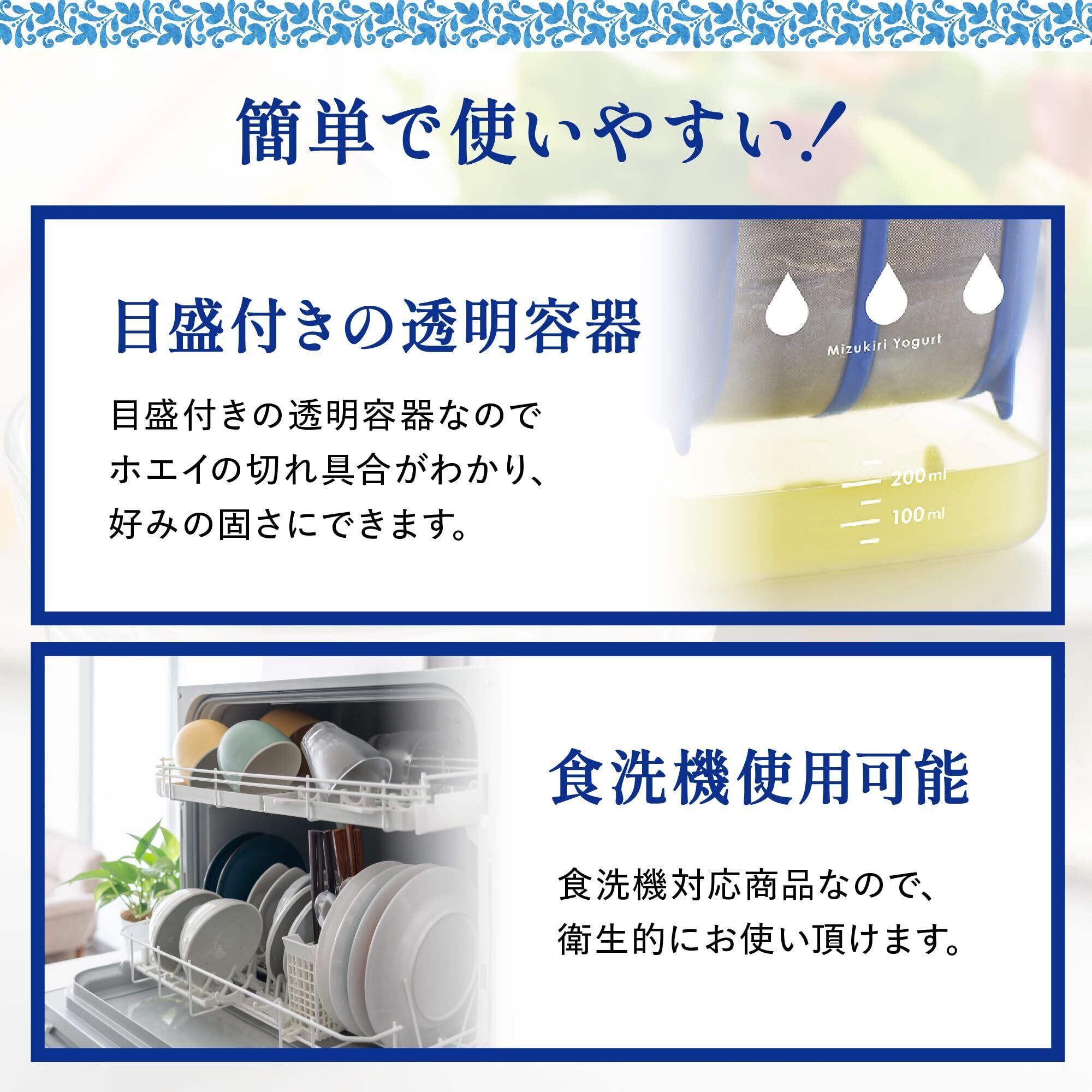 ・市販のヨーグルト400gがまるまる1パック入ります。 ・18-8ステンレスメッシュ使用で繰り返し使えます。 ・目盛付き透明容器なので、ホエイ(乳清)の切れ具合がよくわかります。 ・ゼラチン・寒天等が使用されているヨーグルトは水切りできません。