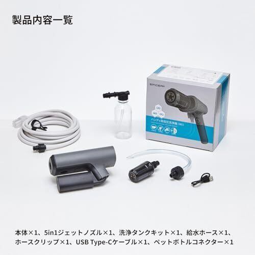 約800gと軽量で、手軽にどこでも持ち運び可能。電源・水栓不要で使えるから庭でも海でもキャンプでも使う場所を選ばない。 3段階の圧力と5つの可変ノズルで、身の回りの洗浄にピッタリ。 ■セット内容物 本体×1、5in1ジェットノズル×1、洗浄タンクキット×1、給水ホース 5m×1、ホースクリップ×1、USB Type-Cケーブル×1、ペットボトルコネクター×1 【重要】 弊社製品の模倣品や不正出品が出回っており、品質・安全性が確保できないことが確認されています。「ASIN:B0DCG3VWQR」が正規販売品となりますので、ご注意ください。