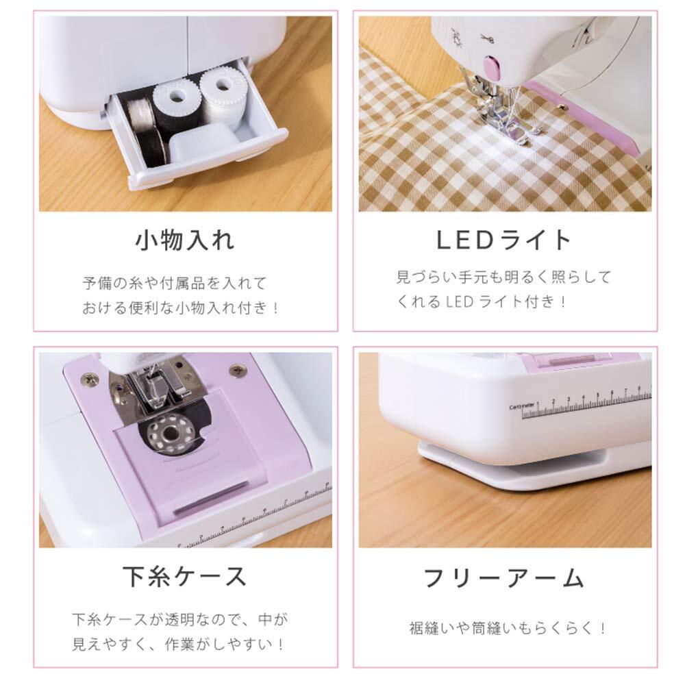 電動ミシン コンパクト家庭用ミシンセット 初心者 12種の縫い目 小型 ミニ ポータブル 低騒音 返し縫い フットコントローラー スピード可調整 収納袋 DIYコットン柄の織物7枚 12色ミシン糸 日本語取扱説明書付き (白)