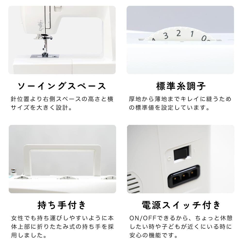 ■コンパクトでも使いやすい機能満載! 【自動糸通し】針穴への糸通しもワンタッチで完了するので、スピーディーに作業をスタートできます。 【押え圧の調整】押え圧を調整することで、厚地や薄地、伸縮する布地もキレイにぬえます。 【調節可能なふり幅/針落ち位置】全ての模様でふり幅の調節が可能。直線縫いの針落ち位置は、中基線~左基線の間で無段階に調節できます。 【返しぬいレバー】針元に近い位置にあるので、手元を見ながら操作できます。 【水平釜】ボビンケースのいらない水平釜は下糸の準備や掃除も簡単。下糸の残量も一目でチェックできます。 【自動ボタンホール】押えにボタンをセットするだけで、ボタンの大きさに合ったボタンホールがぬえます。 【ボタンつけ】ボタン付け押えを付属。ドロップフィードレバーで送り歯を下げて、簡単にボタンを付けられます。 【7枚送り歯】7枚送り歯で薄物から厚物までしっかりと送ります。 【LEDライト】針元を明るく照らし、長時間の使用でも熱くならずランプ切れの心配もありません。 【フリーアーム】補助ベッドを外すだけで、フリーアームに早変わり。付属品も収納できます。