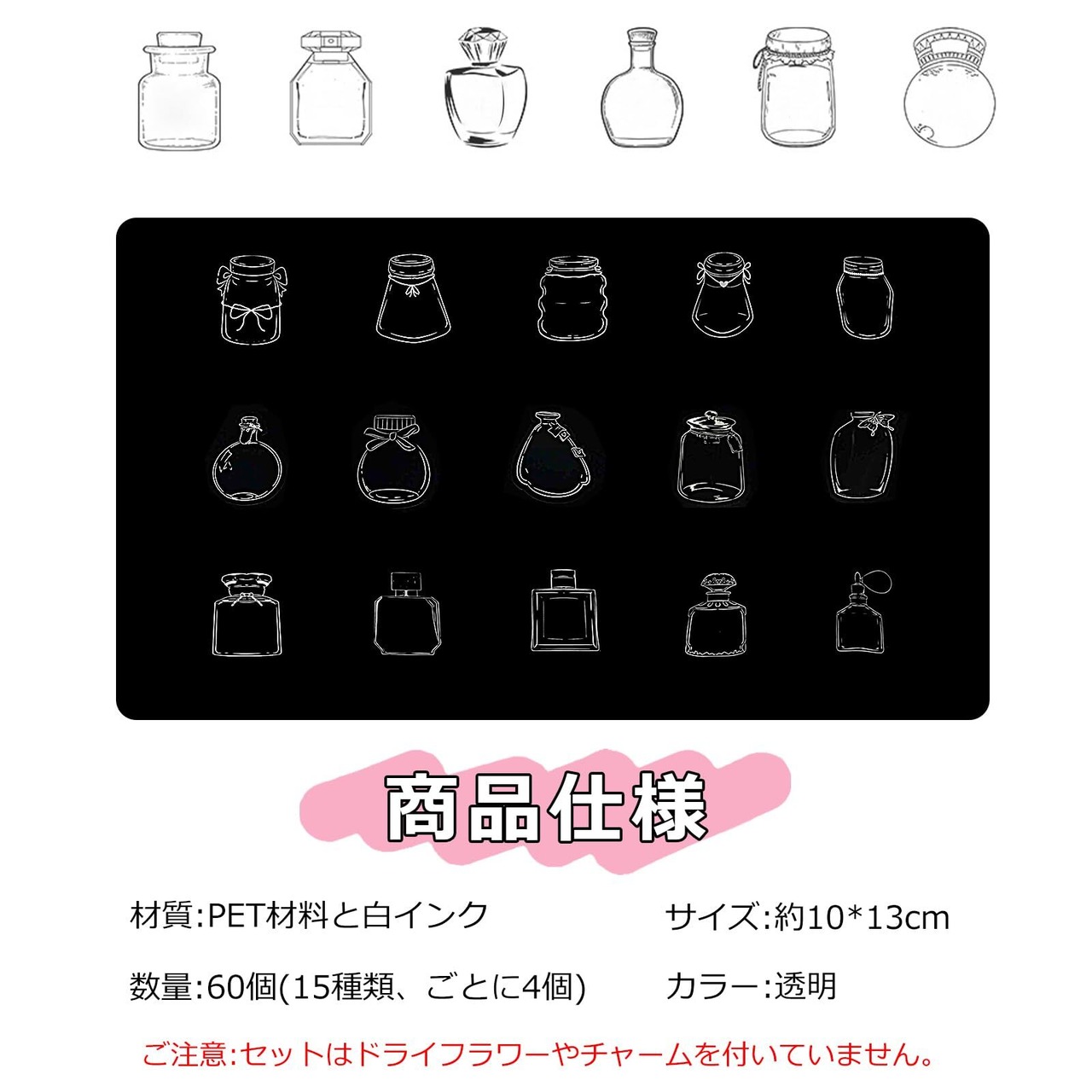 【様々な種類】全部で60個があり、15種類の異なる造形(願い瓶、缶、香水瓶)、デザインが多様なので、安心してデザインできます。実用的で便利です。透明で美しいしおりはページにしっかり掛けて、本とフィットし、剥がれにくく、良い体験を提供します。