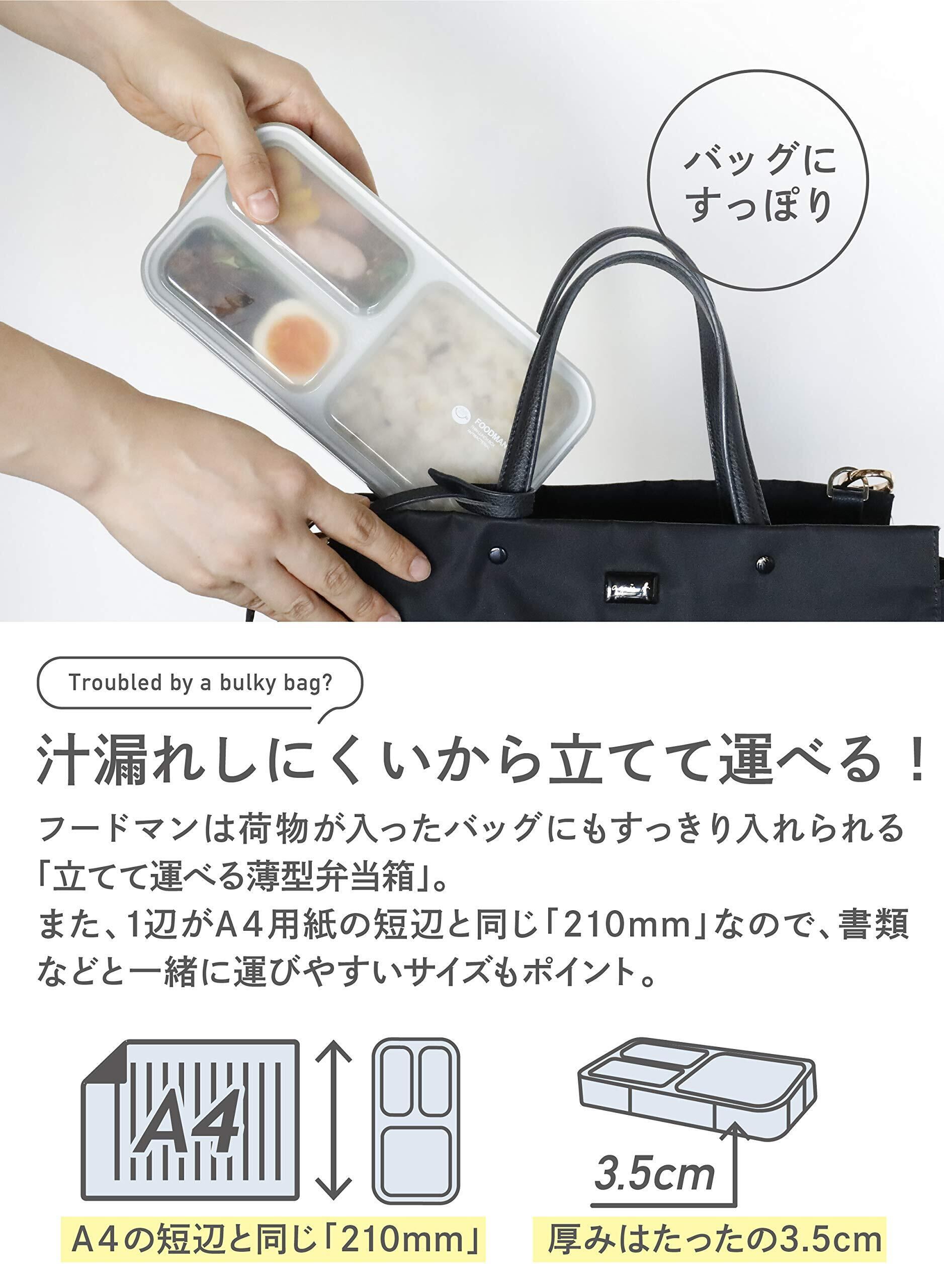 【立てて運べる】通勤や通学のバッグは、荷物でいっぱい! フードマンはそんなバッグにもすっきり入れられる「立てて運べる薄型弁当箱」。A4用紙の短辺と同じ210mmなので、書類などと一緒に持ち運んでも、すっきり収まります。ランチトートなど別持ちしなくて良いので、荷物が増えず通勤通学が快適!