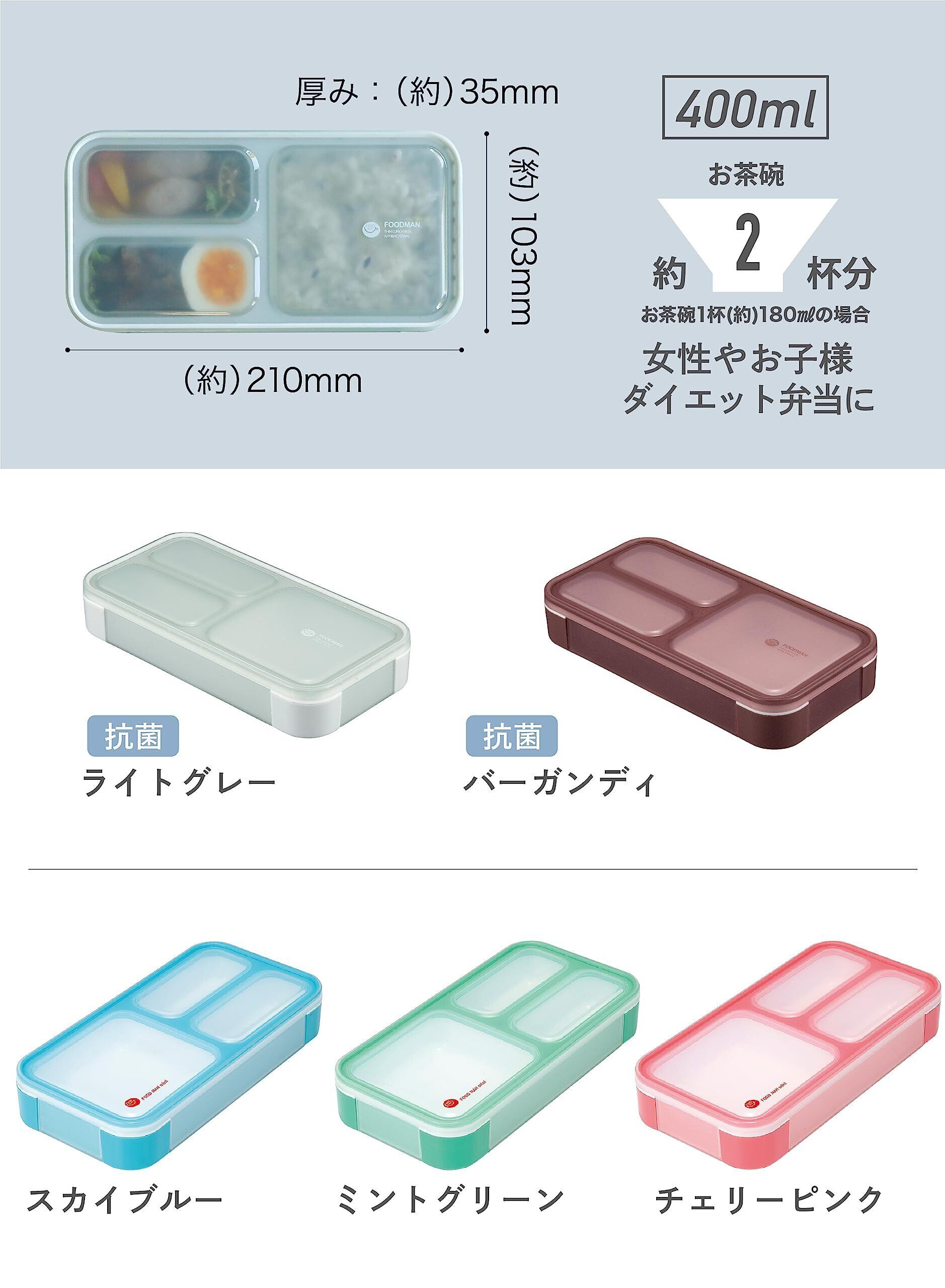 フードマン 弁当箱 立てて運べる 薄型弁当箱 400ml [ 抗菌 ] ライトグレー 汁漏れしにくい Wシーリング 4点ロックでしっかり固定 シービージャパン DSK