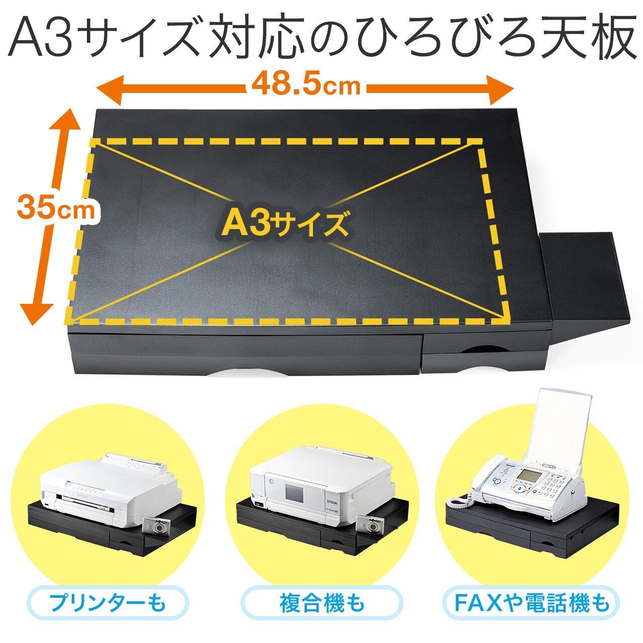 天板サイズは幅48.5cm×奥行35cmで、プリンタや複合機、FAXや電話機などA3サイズの機器も設置可能です。A4サイズの用紙やノートパソコンが収納できる大サイズの引き出し付きです。