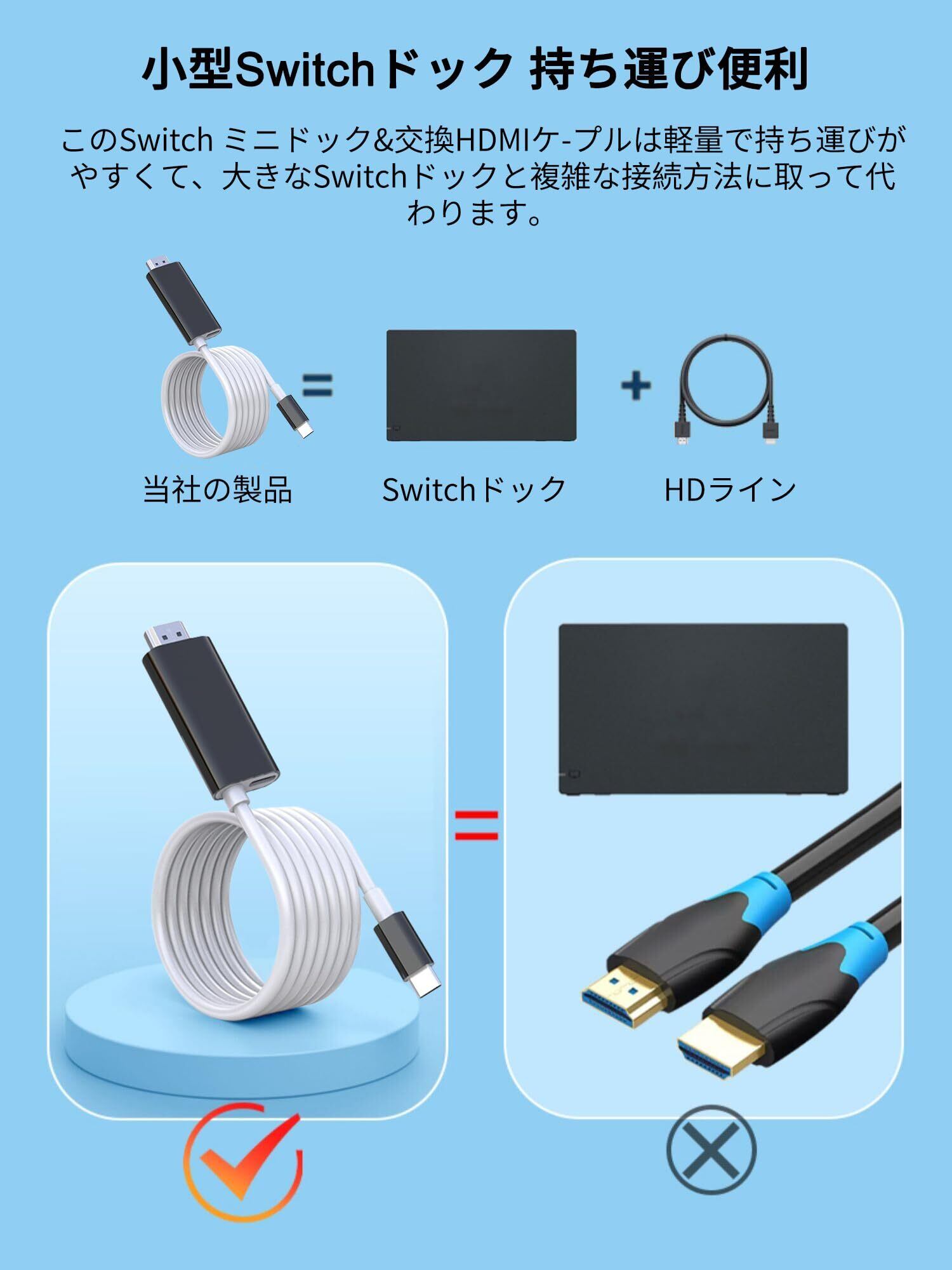 【Switch ドック不要】Switch用のドックを使用しないで、本製品のケーブルを接続するだけで簡単にテレビやディスプレイへの映像出力が可能です。旅行先や外出先で、Switchに接続するだけで大画面でゲームを楽しむことができます。ご注意:Nintendo Switch/Switch OLEDに対応しておりますが、Nintendo Switch Liteとの互換性はありません。Youtubeはサポートされていない