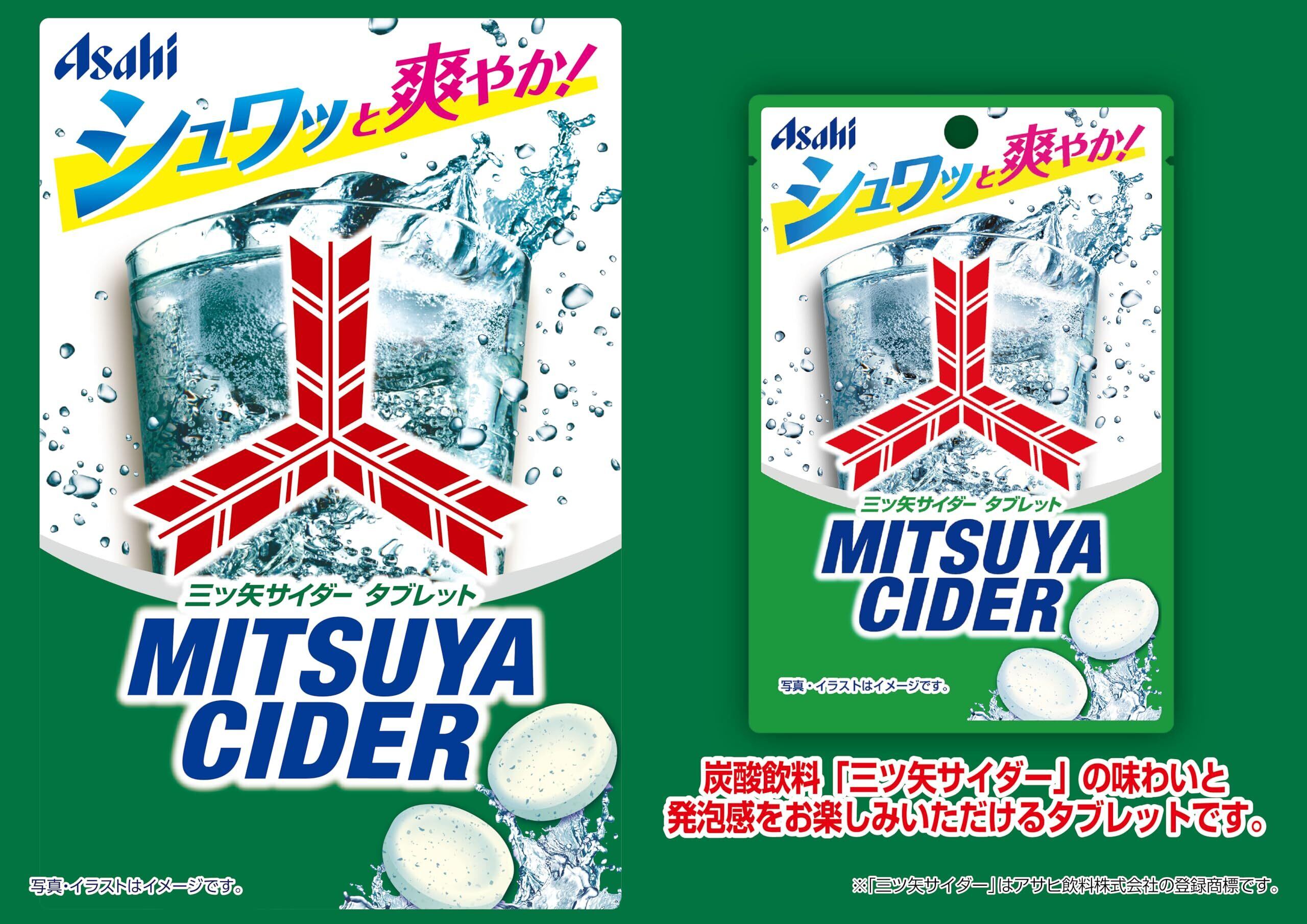 三ツ矢サイダー」の味わいと発泡感をイメージしたタブレット。タブレットに重曹を練りこんであるので、噛むとシュワっと発泡する設計になっています。小分けで食べることのできるジップの付いた小袋タイプの入れ物です。舐めても噛んでも爽やかなサイダー感と味わいをお楽しみいただけます。