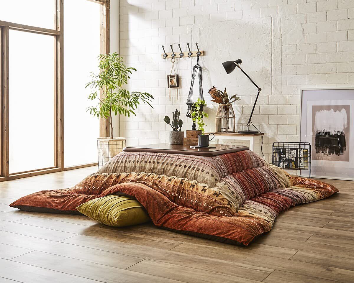 かわいらしいギャッベ柄をモチーフにした大人かわいいこたつ布団です。繊細なプリントが特徴です。表地には肌触りのよい短毛のマイクロファイバーを使用しています。部分暖房のコタツは電気代もおトクです。