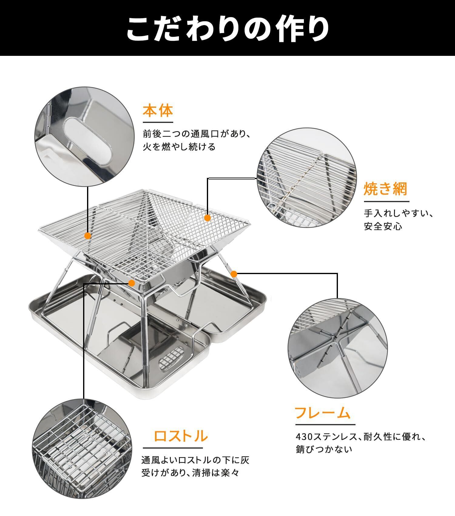【仕様】 サイズ(展開時)39*38.5*22cm (収納時)41*21*7cm 焼き面積:30*30cm 重量:2.5kg 材質:本体/フレーム:430ステンレス 焼き網:201ステンレス