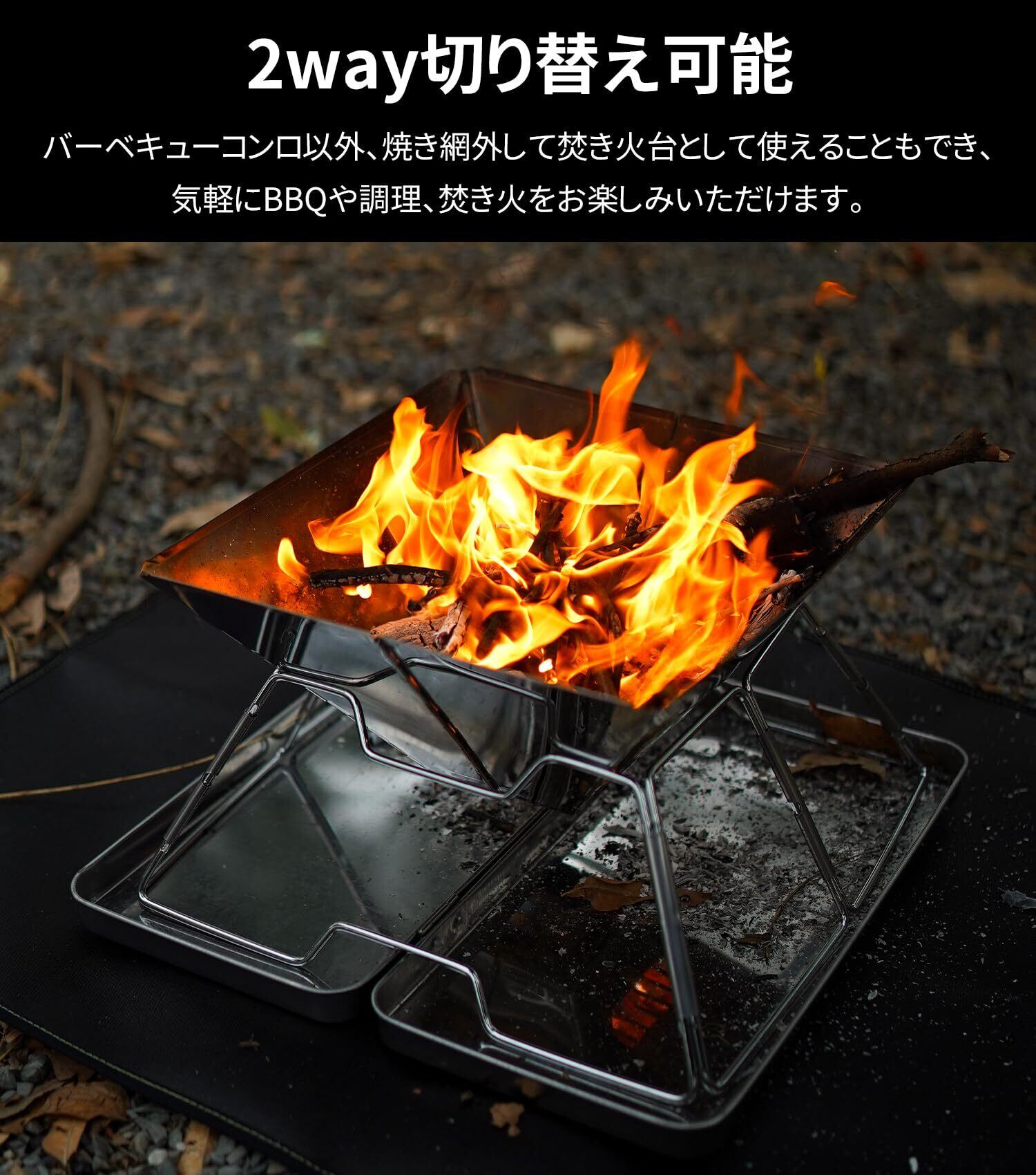 【1台2役・手入れしやすい】焼き網を載せたら、バーベキューコンロとしてバーベキューできます。焼き網を下げたら、焚き火台としても使っていただけます。厳選されたステンレススチール、焚き火の熱にも耐えられる。BBQや焚き火で汚れた場合は丸ごと洗うことができます。