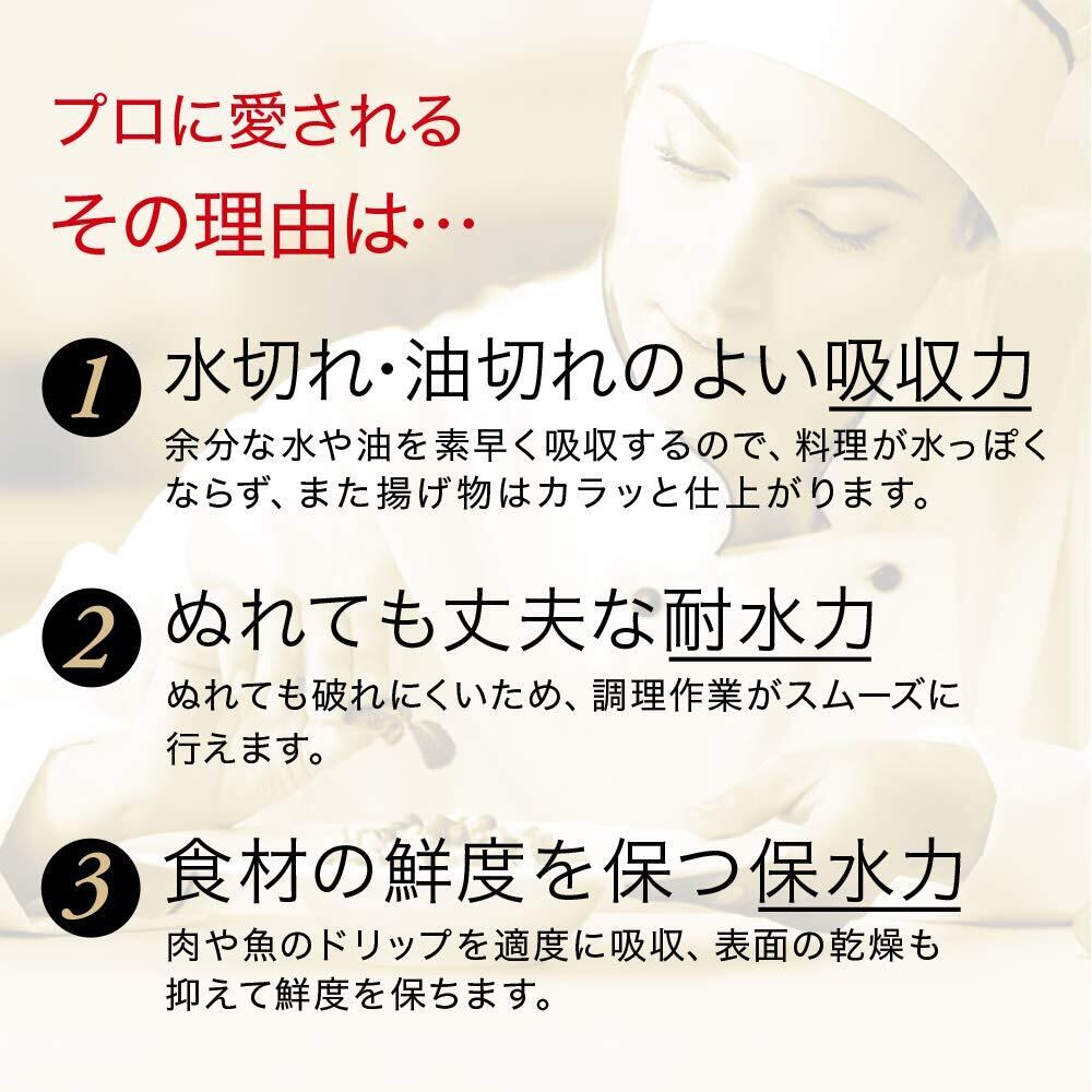 プロが愛用する本格派クッキングペーパー ●油切れ・水切れのよい吸収力 ●ぬれても丈夫な耐水力 ●食材の鮮度を保つ保水力 ●用途:天ぶら・揚げ物等の油切り、生鮮品や野菜類の鮮度保持、野菜の水切りや鮮魚の表面のふきとり、油・出し汁こし、フライパンの汚れふき、テーブル・調理台の汚れふき ●Mサイズ(265mm×240mm)