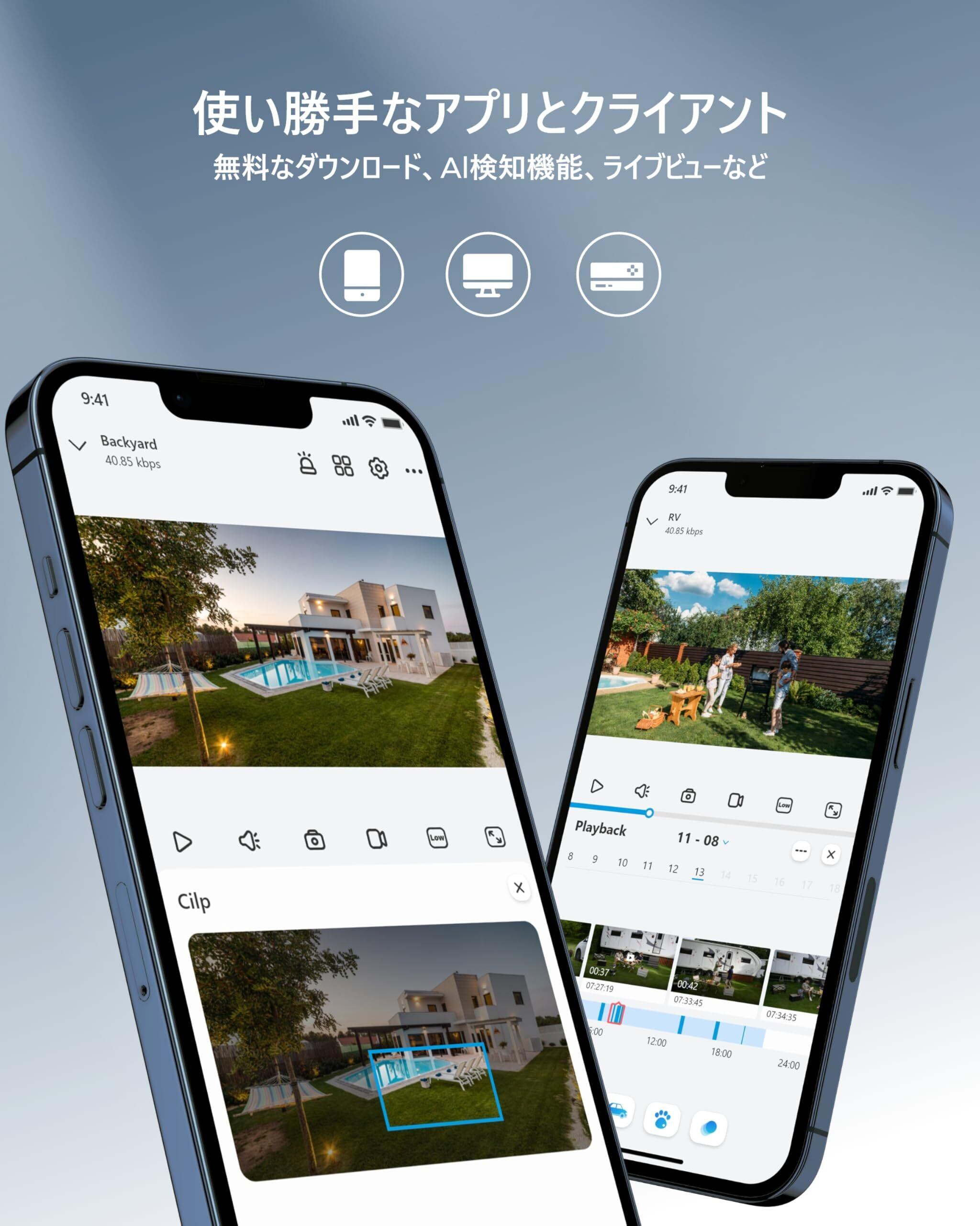 Alexa対応・双方向会話:このWiFiカメラはAlexaとGoogle Assistant対応、掃除中や食事中にAlexa設備に「ねぇ、Reolinkカメラを見せて」のように声をかけると、カメラのライブビュー画面がAlexaへ転送して、あなたはAlexaデバイスから直接に現場の状況を確認できます。マイクとスピーカもカメラに内蔵され、アプリからカメラに登録して遠隔操作時に双方向会話できます。無料なReolinkアプリやクライアントを使って、お宅や事務室に何が起こっているのか、常に確認できるだから、安心です。