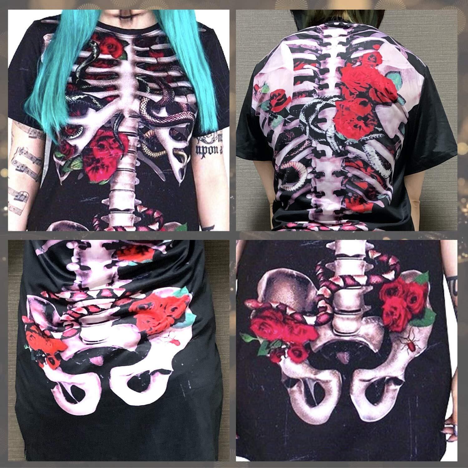 (ADOSSY) スケルトン 薔薇 Tシャツワンピ ミニ ハロウィン コスプレ コスチューム (L)