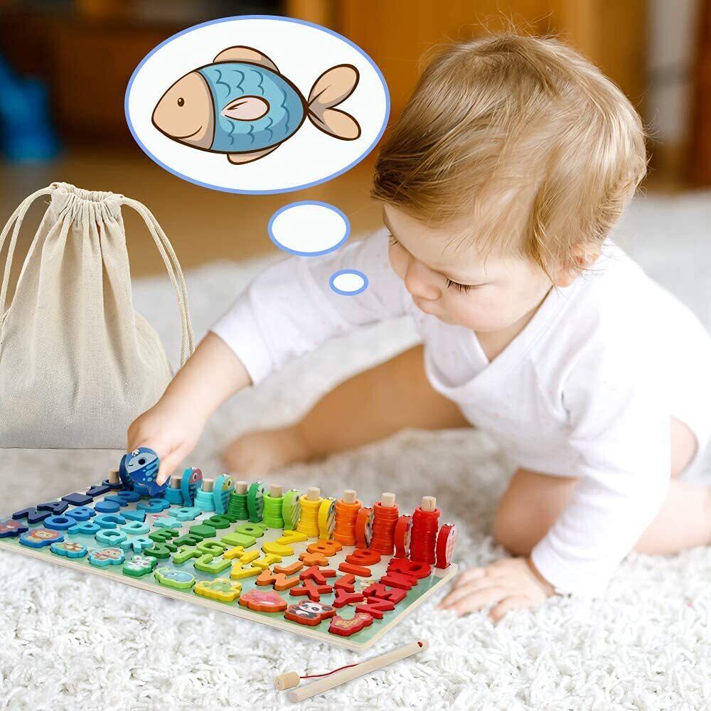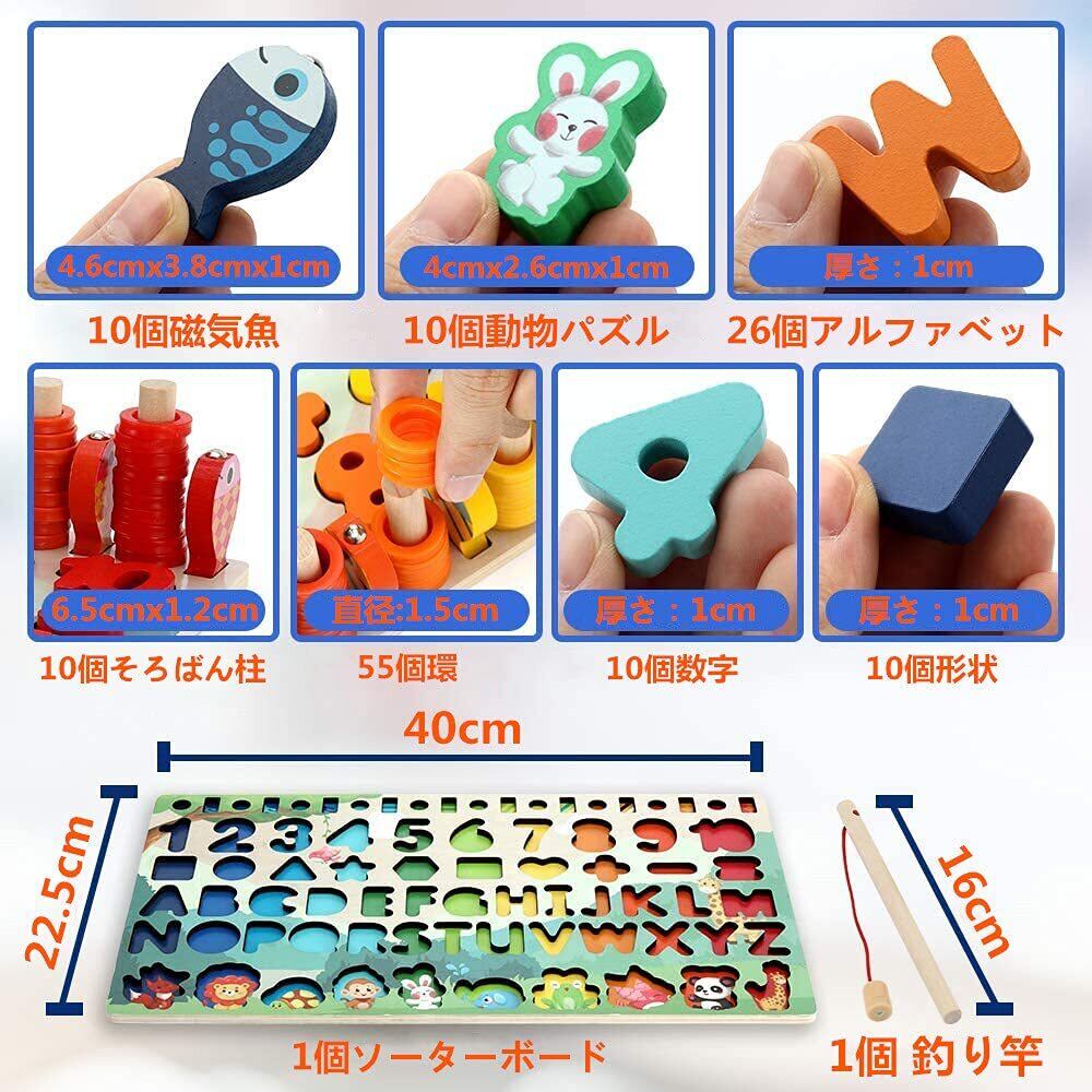 【モンテッソーリ 教具】数字、英語、動物、魚釣り、積み木!5種類パズルモンテッソーリ おもちゃセット!天然木製の材質、心を込めての製造、欧州基準の安心塗装および精密な加工で積み木の角を磨きました積み木です。角も丸くなっているので小さなお子様にも安全に遊んでいただけます。大きさもお子様の手に馴染むように設計されています。