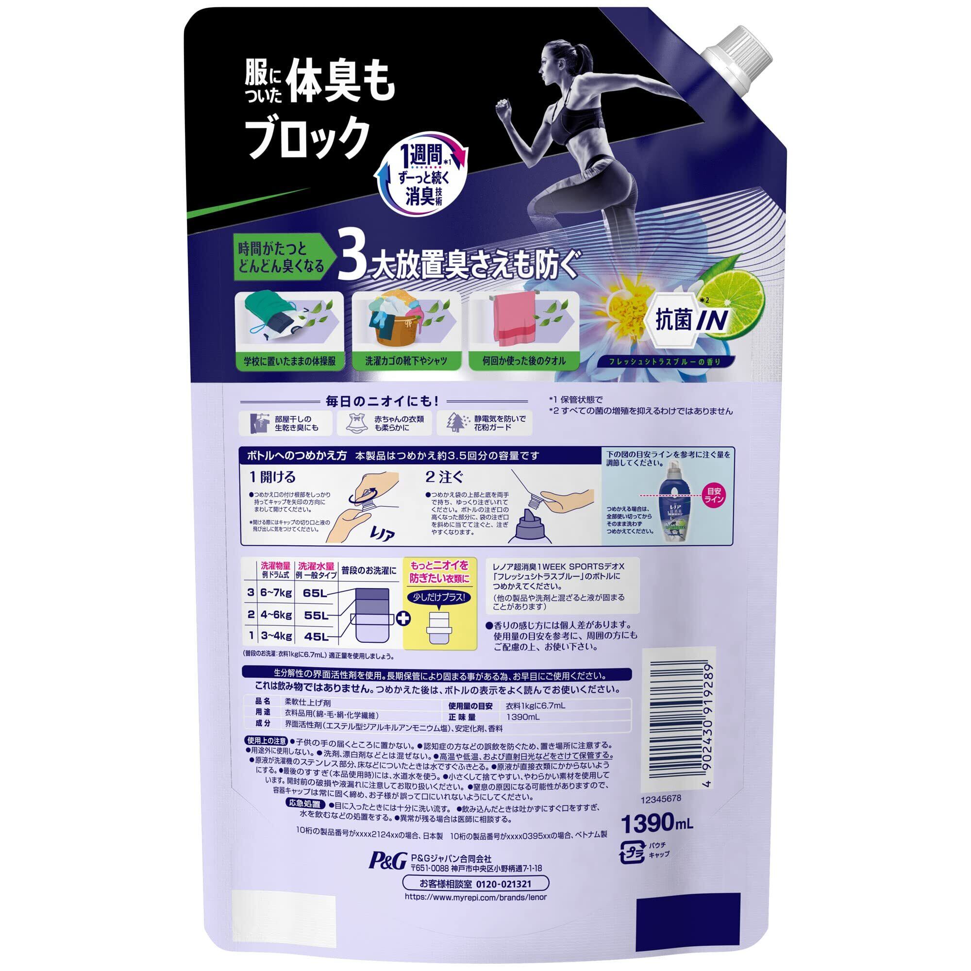 レノア 超消臭1WEEK 柔軟剤 SPORTSデオX フレッシュシトラスブルー 詰め替え 大容量 1390mL(約3.5倍) 1 袋