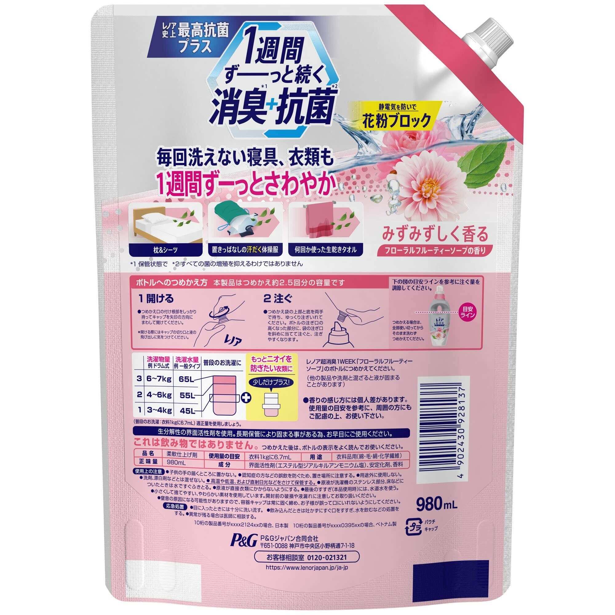 レノア 超消臭1WEEK 柔軟剤 フローラルフルーティーソープ 詰め替え 大容量 約2.5倍(980mL) 1 袋