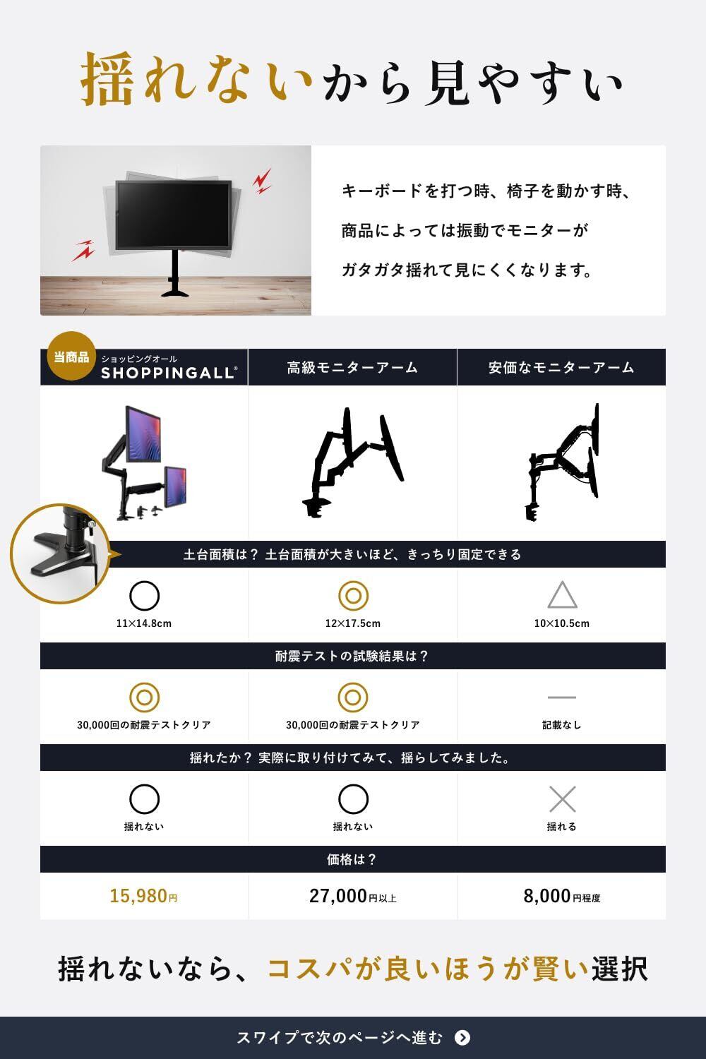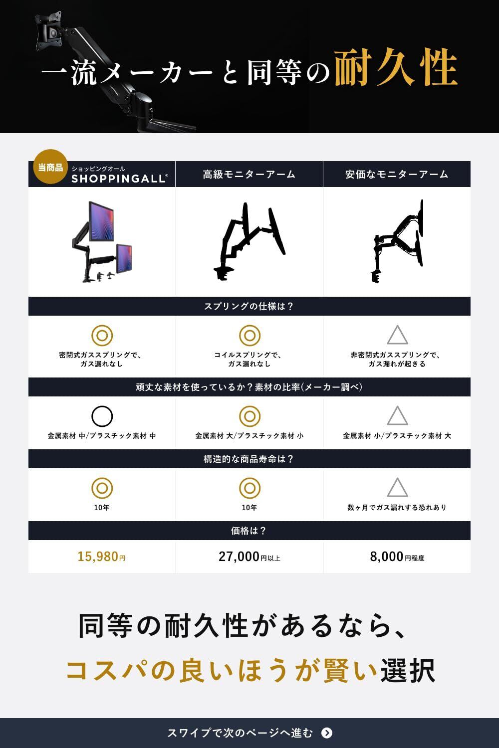 【 製品寿命10年 一流メーカーと同等の耐久性 】SHOPPINGALLは密閉式ガススプリングを採用しているため、ガス漏れしません。一流メーカーと同等の耐久性があるなら、コスパの良いほうが賢い選択。【 安価な類似品にご注意ください 】安価な類似品は非密閉式ガススプリングを採用しているため、数が月でガス漏れが発生し、モニターを支えられなくなる事例が報告されています。 .