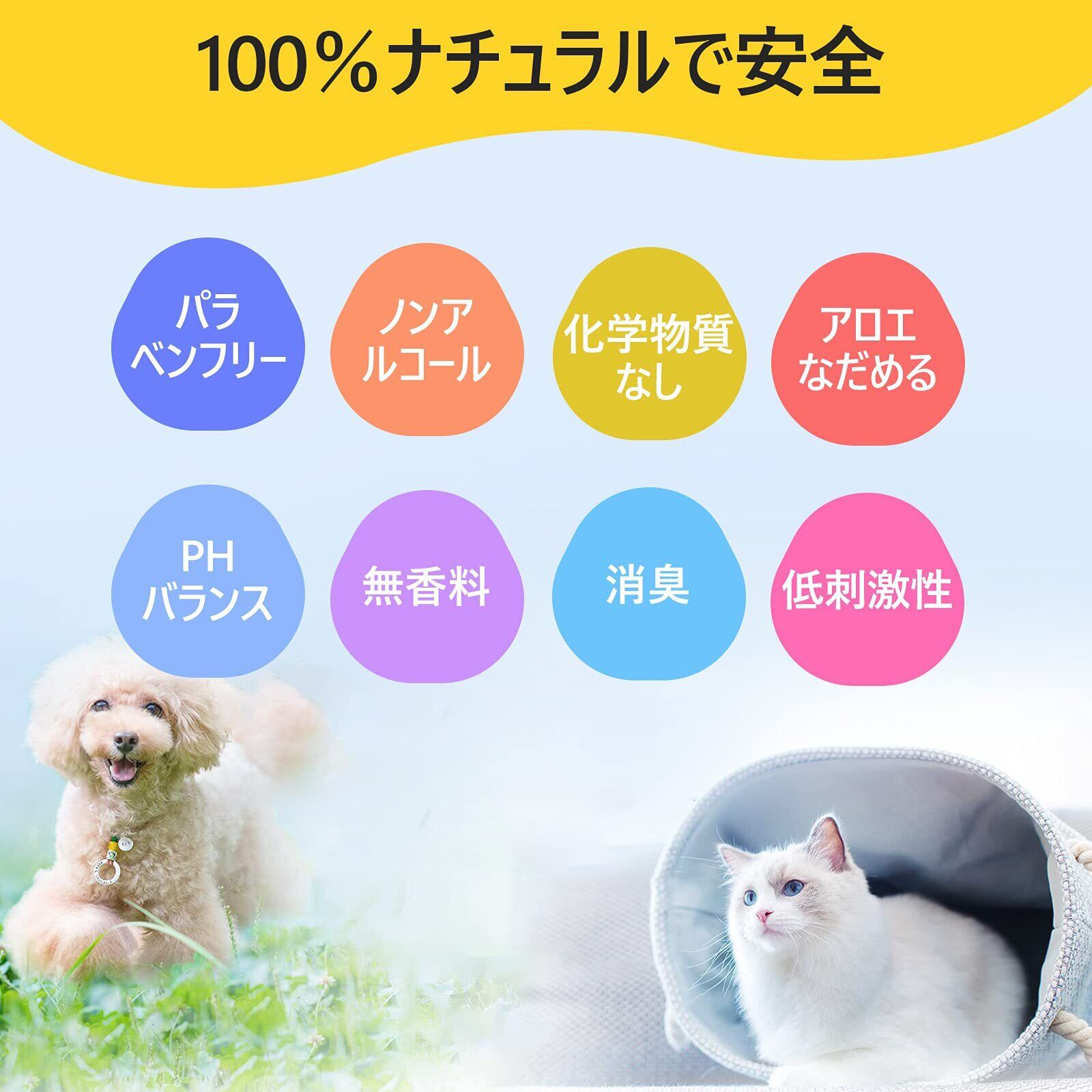 【天然成分、保湿】:すべて天然成分を使用して、ペットのお肌にやさしい弱酸性、99%水でできており、刺激性が低い。拭いた後の被毛や皮膚を保湿の効果あります。
