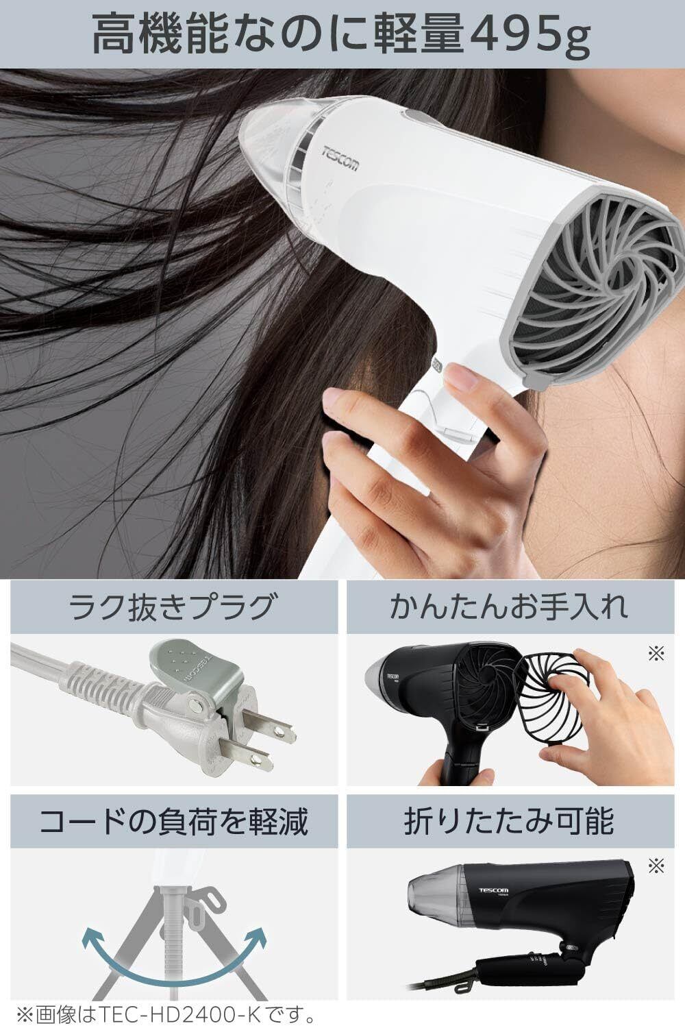 従来機種より12%軽量化!※5大風量なのに495Gを実現。500mlペットボトルよりも軽く、ロングヘアーでも疲れにくい。