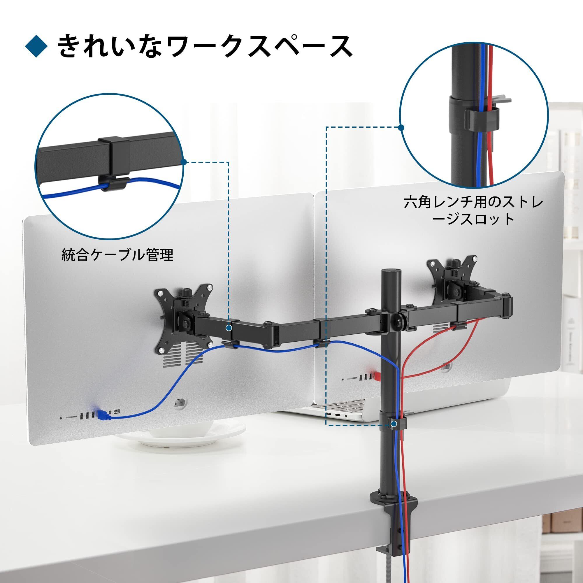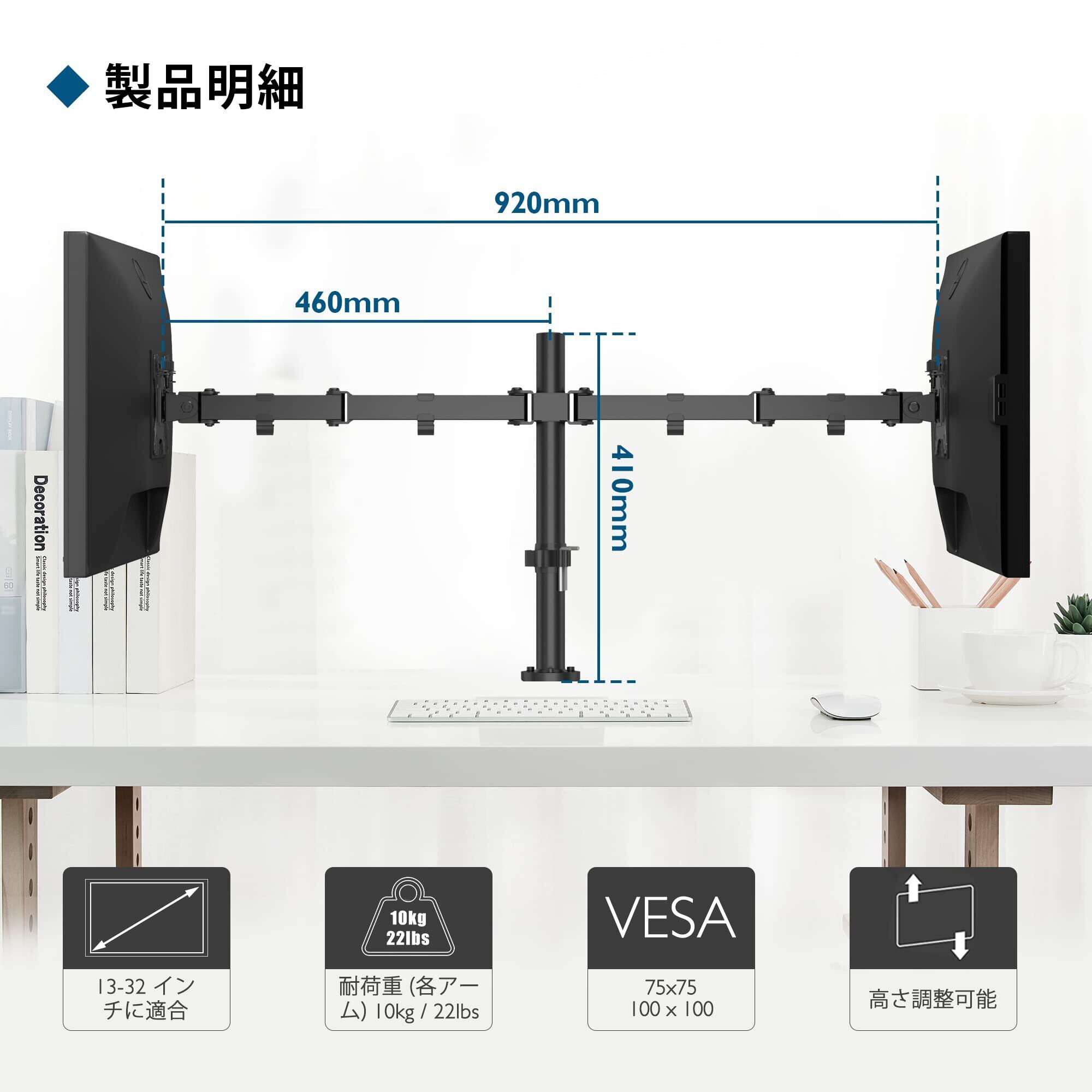 【モニターアーム デュアル】 1homefurnit デュアル モニターアームは13〜30インチのモニターに対応し、各アームの耐荷重は最大10kgです。VESA規格75x75mmおよび100x100mmに対応し、デュアルモニターセットアップに最適です。作業効率を向上させ、デスクスペースを有効活用します。