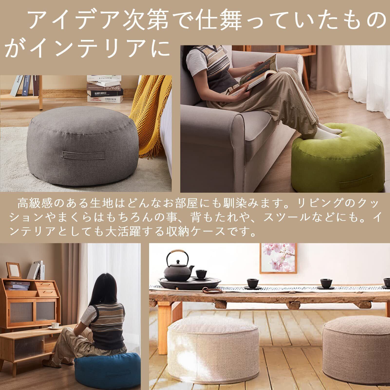 【クッションになる布団収納ケース】収納もインテリアも妥協しない快適な空間づくり。インテリア性の高い生地に馴染みの良いナチュラルな色合いは、来客時に置きっぱなしでも生活感なく空間に溶け込みます。布団収納ですが、「収納」と「インテリア」どちらも妥協せずお使いいただけます。
