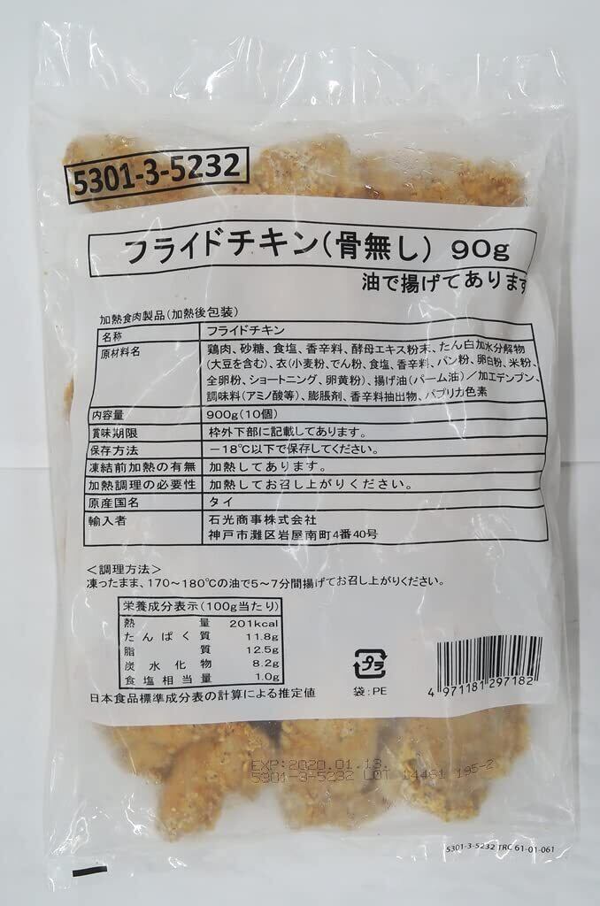 鶏肉、砂糖、食塩、香辛料、酵母エキス粉末、たん白加水分解物(大豆を含む)、衣(小麦粉、でん粉、食塩、香辛料、パン粉、卵白粉、米粉、全卵粉、ショートニング、卵黄粉)、揚げ油(パーム油)/加工デンプン、調味料(アミノ酸等)、膨脹剤、香辛料抽出物、パプリカ色素