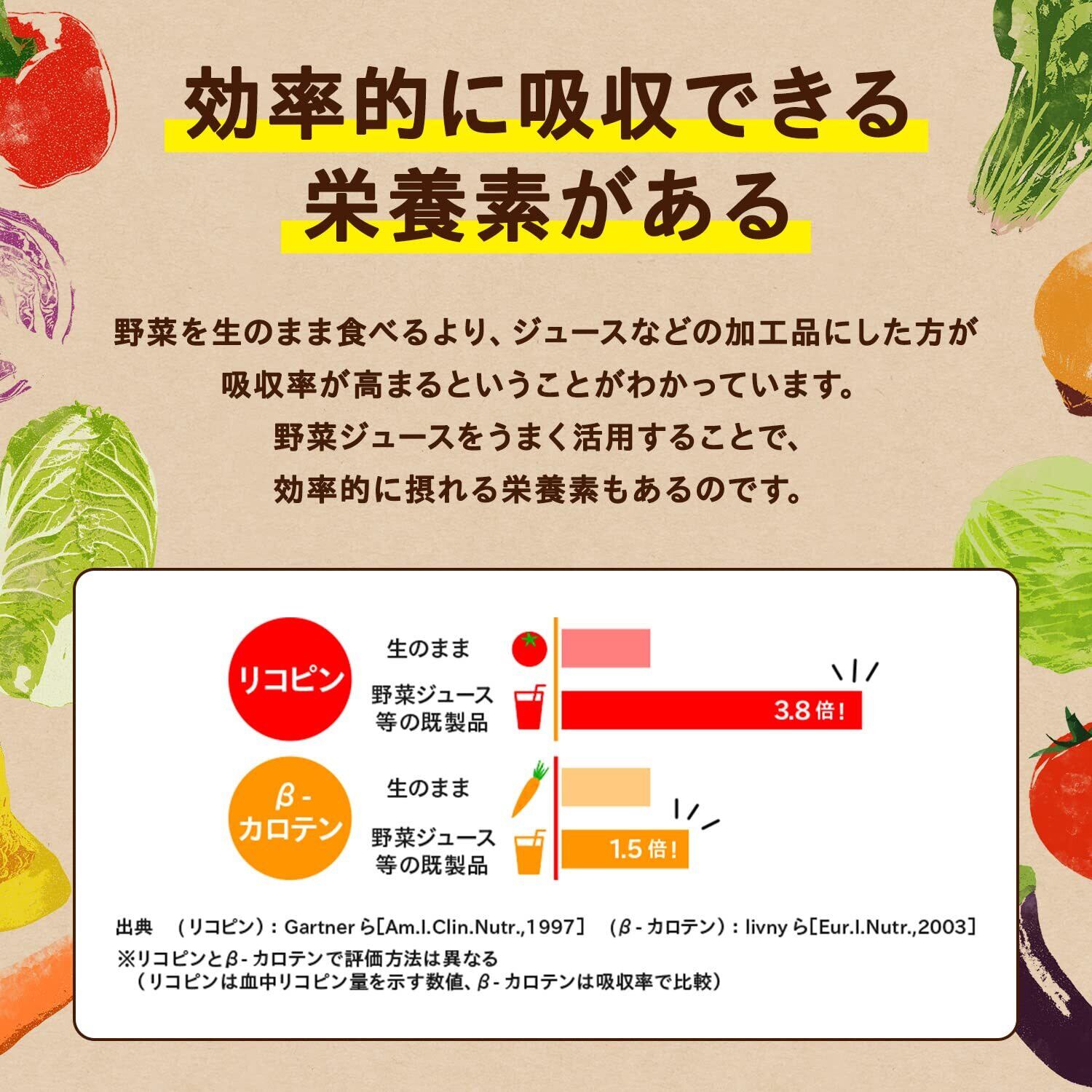 「野菜生活100」オリジナルは、20種類の野菜と3種類の果実を使用した野菜果実ミックスジュースです。1食分の野菜※を使用し、野菜汁70%+果汁30%=100%。野菜比率70%でありながらフルーティーなおいしさを実現。β‐カロテンの高いにんじん汁を厳選。にんじんの青臭い香りをカットし、にんじん汁のコクと甘みで家族みんながおいしく手軽に野菜を補えます。※厚労省推進・健康日本21の目標値(1日350g)の約1/3である野菜120g分。野菜の全成分を含むものではありません。