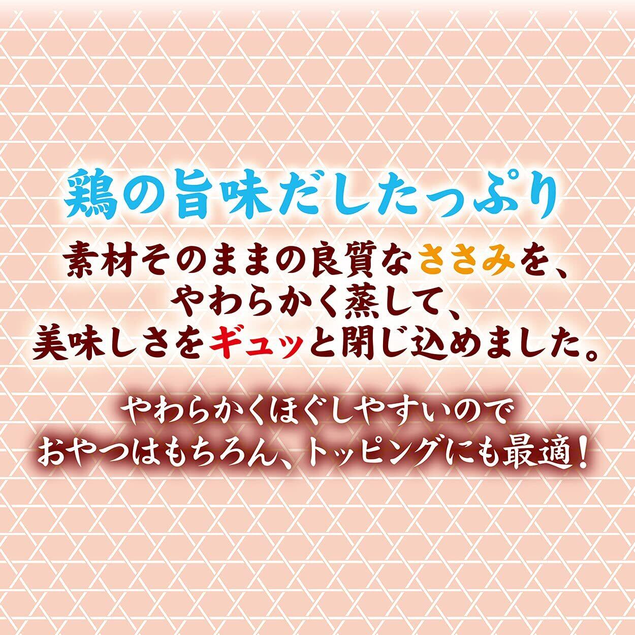 鶏の旨味だしたっぷり。素材そのままの良質なささみを、やわらかく蒸して、美味しさをギュッと閉じ込めました。やわらかくほぐしやすいのでおやつはもちろん、トッピングにも最適!袋のままお湯につけて人肌程度に温めるとより美味しくなります。着色料不使用。